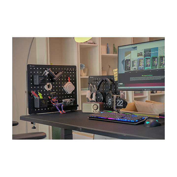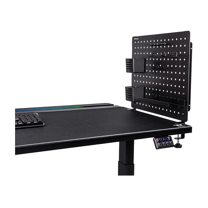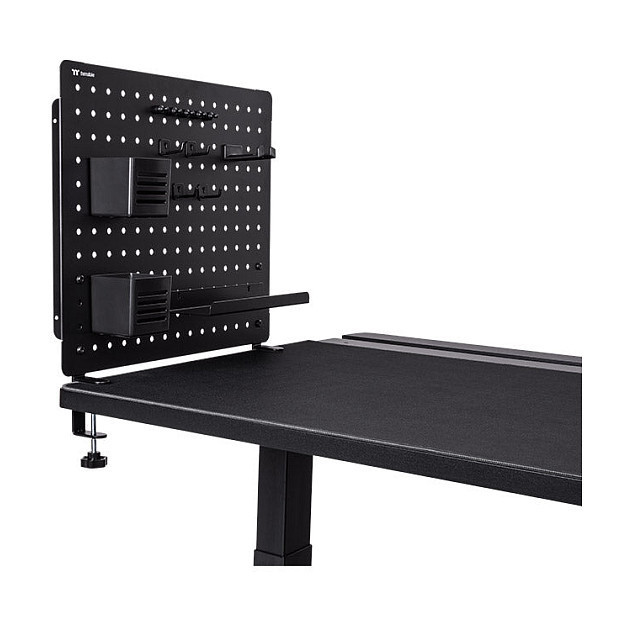 "Thermaltake GEA-GDP-DPLBLK-01. Material: Steel, Product colour: Black, Maximum load weight: 10 kg. Dimensions (WxDxH): 520 x 105 x 575 mm"\n"Thermaltake provides gamers and office workers with a highly compatible and easy-to-install desktop storage solution. The Gaming Desk Pegboard is a multi-functional, beautiful and stylish desk organizer and storage stand that provides more than one installation method. Also, the pegboard features a sturdy steel structure and powder-coated surface, offering rugged performance, with oval nail holes and a waterproof surface that allows users to DIY their layout.
