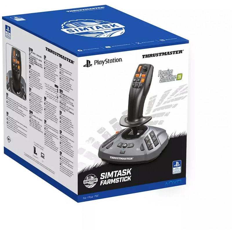 "Thrustmaster SimTask FarmStick. Device type: Flightstick, Gaming platforms supported: PC, PlayStation 5, Gaming control technology: Analogue / Digital. Connectivity technology: Wired. Product colour: Black, Compatibility: Farming Simulator 25. Power source: Cable. Windows operating systems supported: Windows 10, Windows 11"\n"SIMTASK FARMSTICK is the joystick designed for controlling farming and heavy machinery, developed based on Thrustmaster's know-how in flight simulation.