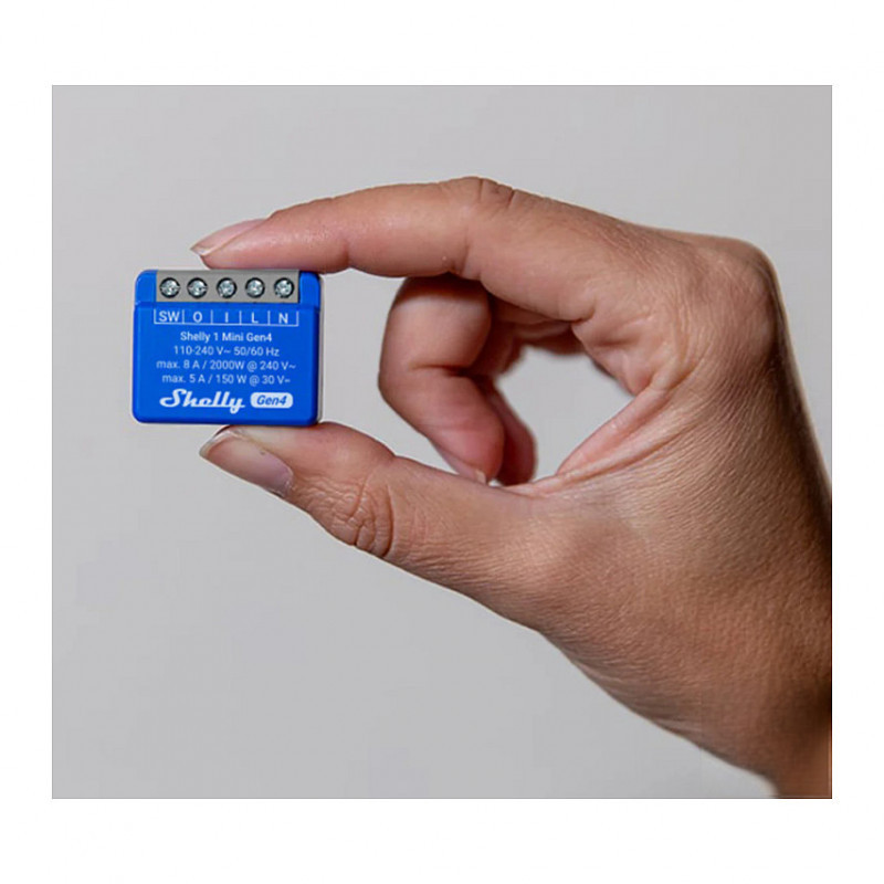 "Shelly 1 Mini Gen4. Type: Smart switch, Number of poles: 1P, Connectivity technology: Wireless. AC input voltage: 110 - 240 V, AC input frequency: 50 - 60 Hz, Power consumption (typical): 1.2 W. Width: 34 mm, Depth: 16 mm, Height: 29 mm. Quantity per pack: 1 pc(s)"\n