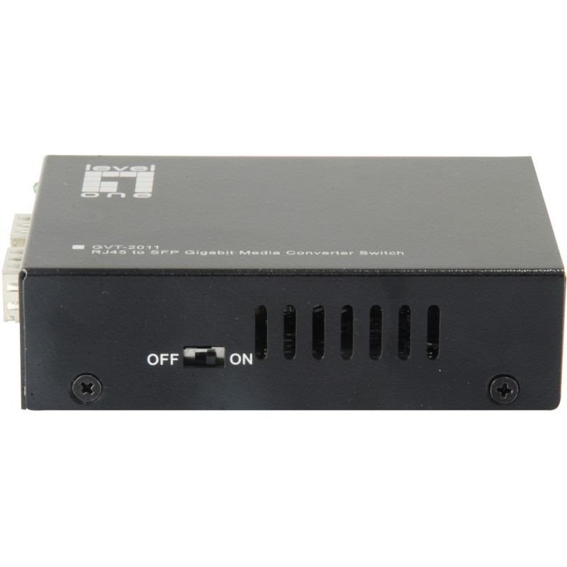 "LevelOne RJ45 to SFP Gigabit Media Converter Switch, 2 x SFP, 1 x RJ45. Maximum data transfer rate: 1000 Mbit/s, Converter input interface: 10Base-T, 100Base-TX, 1000Base-T, Converter output interface: 1000Base-X. Mean time between failures (MTBF): 30000 h. LED indicators: Activity, Link, Power, Product colour: Grey. Fiber optic connector: SFP, Connectivity technology: Wired. Input voltage: 110 - 240 V, Output voltage: 5 V, Output current: 2 A"\n"The LevelOne GVT-2011 Gigabit Media Converter Switch provides 1 RJ45 and 2 SFP ports to support conversion between 10/100/1000Base-T and 1000Base-X networks. With the two SFP ports, the converter switch provides high reliability and flexibility to extend the media transmission distance up to 550m, 20km, or longer depending on the SFP fiber optical transceivers. It allows the two types of segment to connect easily, efficiently and inexpensively.