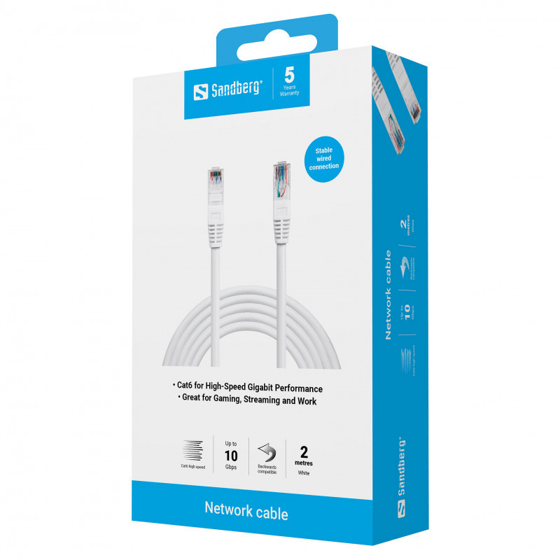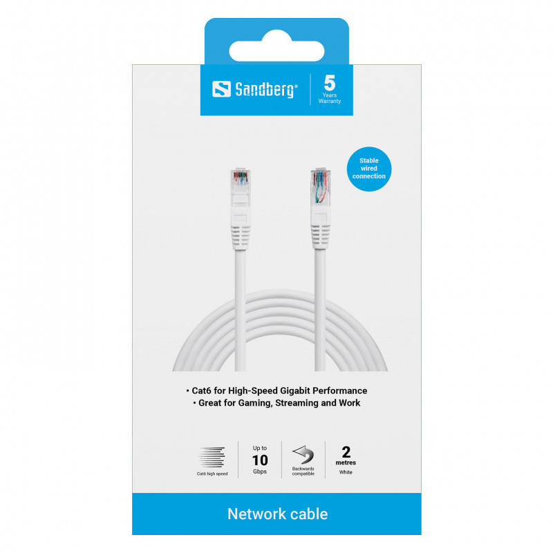 "Sandberg Network Cable UTP Cat6 2 m. Cable length: 2 m, Cable standard: Cat6, Cable shielding: U/UTP (UTP), Connector 1: RJ-45, Connector 2: RJ-45, Product colour: White"\n"Sandberg Network Cable UTP Cat6 is perfect for connecting your PC to broadband, LAN, router, or switch – or for use between switches and in patch panels. The Cat6 standard ensures high transfer speed and minimal data loss, optimized for Gigabit Ethernet (10 Gbps)."