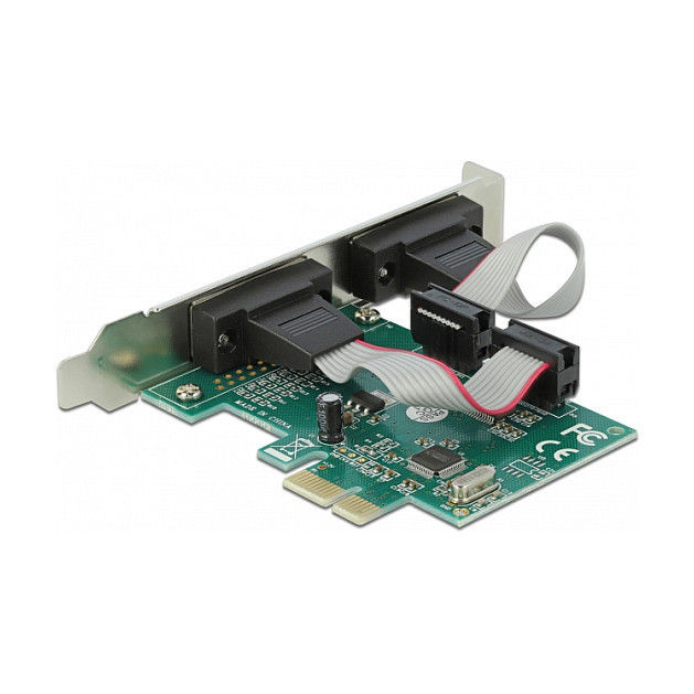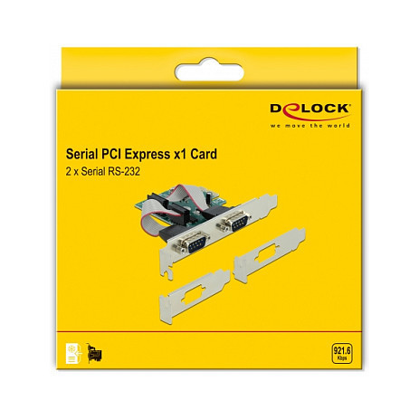 "DeLOCK PCI Express x1 Card to 2 x Serial RS-232. Host interface: PCIe, Output interface: RS-232, Expansion card form factor: Low-profile. Product colour: Green, Purpose: PC. Data bits: 5, 6, 7, 8, Stop bits: 1, 2"\n"The PCI Express card by Delock expands a PC by two external serial RS-232 ports. Different devices such as scanner, protocol converter, IoT devices etc. can be connected to this card.