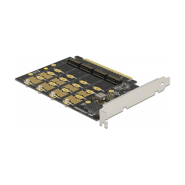 This PCI Express card by Delock expands the PC by four M.2 slots. M.2 SSDs in format 2280, 2260, 2242 and 2230 can be connected. The card requires the PCIe bifurcation of the motherboard to split the PCIe signal in order to use multiple slots with M.2 SSDs."