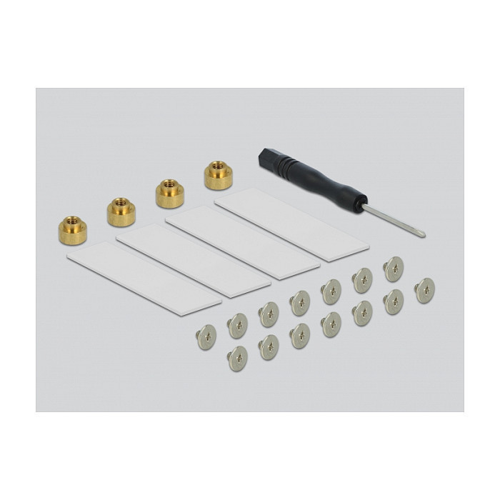 "DeLOCK PCI Express x16 Card to 4 x internal NVMe M.2 Key M. Host interface: PCIe, Output interface: M.2, Expansion card standard: PCIe 3.0. Product colour: Grey, Cooling type: Active, Number of fans: 1 fan(s). Data transfer rate (max): 32 Gbit/s. Width: 95 mm, Depth: 202 mm, Height: 8 mm"\n"This PCI Express card by Delock expands the PC by four M.2 slots. Up to four M.2 SSDs in format 2280, 2260, 2242 and 2230 can be connected. With the help of the large heat sink and the fan, sufficient cooling of the M.2 modules is guaranteed.
