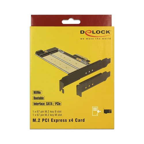 "DeLOCK 89630. Host interface: PCIe, Output interface: M.2, SATA. Cooling type: Passive, Country of origin: China. Windows operating systems supported: Windows 10, Windows 7, Windows 8, Windows 8.1. Package type: Hanging box"\n"This PCI Express card by Delock expands the PC by two M.2 slots. One M.2 SATA module can be connected in format 22110, 2280, 2260, 2242, 2230 with this card and connected via SATA cable to the motherboard. Additionally, one M.2 PCIe module in format 22110, 2280, 2260, 2242, 2230 can be connected. Both slots can be used at the same time."