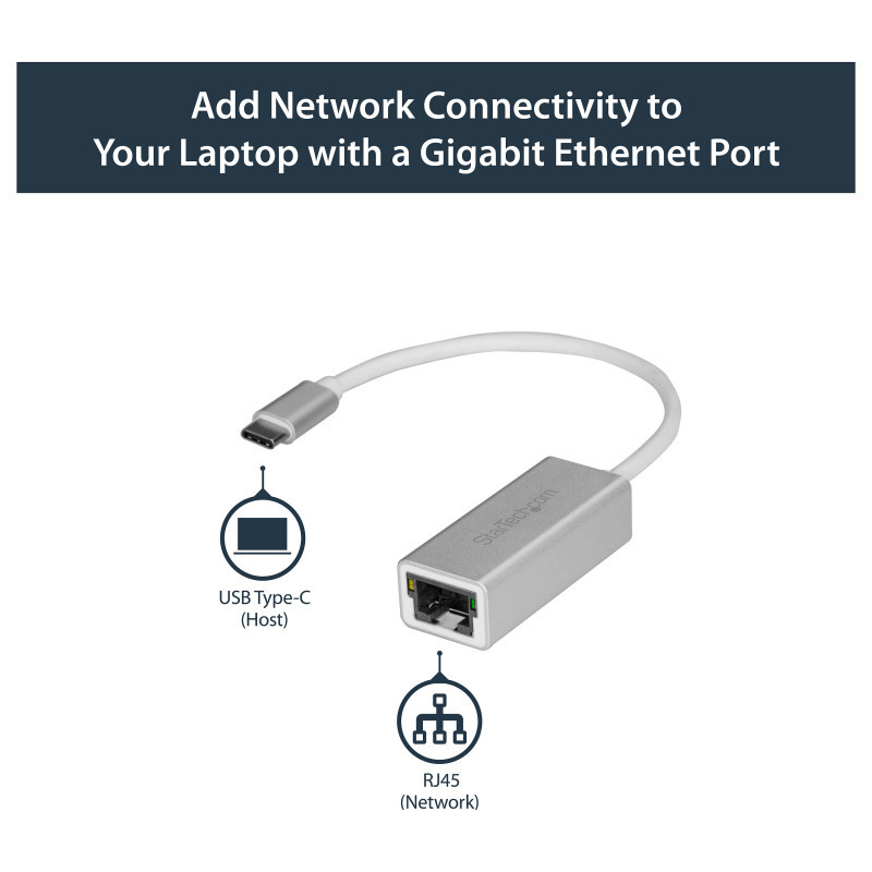 "StarTech.com USB-C to Gigabit Network Adapter - Silver. Connectivity technology: Wired, Host interface: USB, Interface: Ethernet. Maximum data transfer rate: 5000 Mbit/s. USB powered. Product colour: Silver"\n"Use this sleek aluminum converter to add a Gb Ethernet port to your MacBook, Chromebook or laptop with USB Type-C