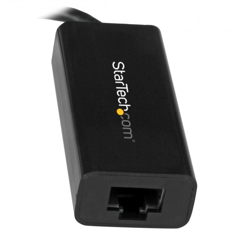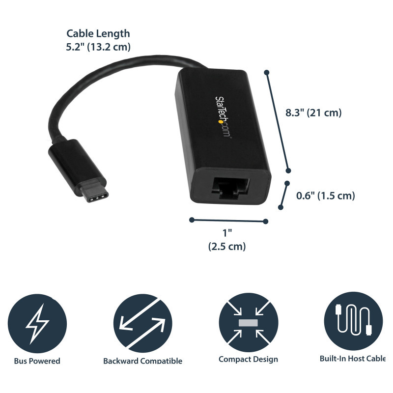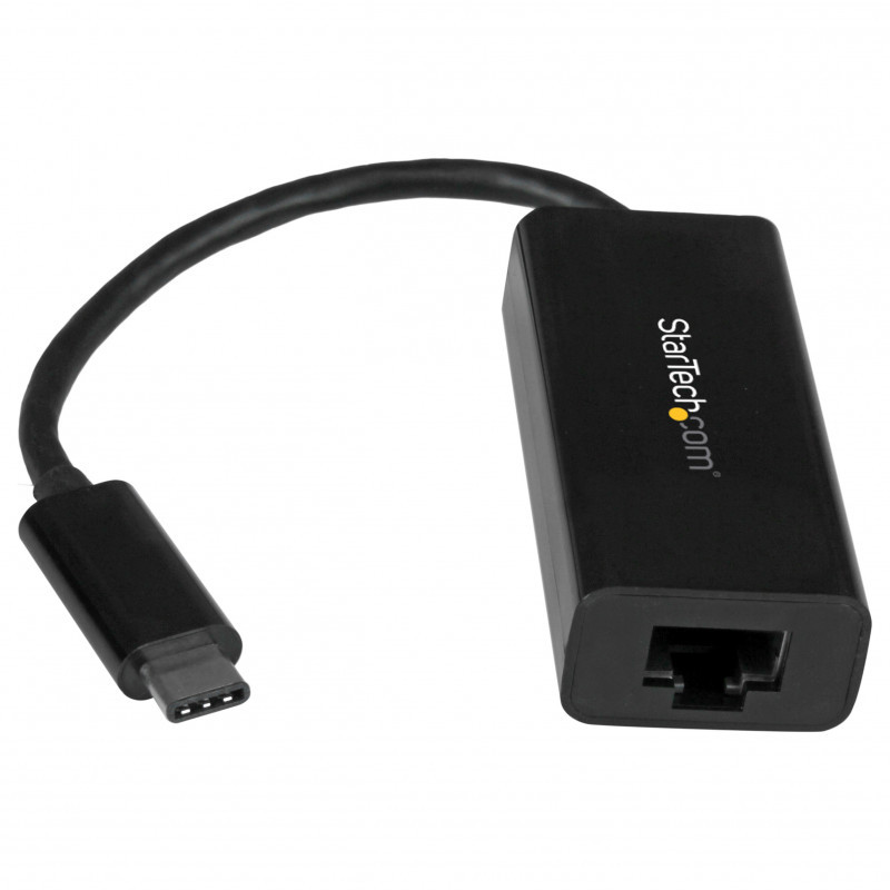 "StarTech.com USB-C to Gigabit Ethernet Adapter - Black. Connectivity technology: Wired, Host interface: USB, Interface: Ethernet. Maximum data transfer rate: 5000 Mbit/s. USB powered. Product colour: Black"\n"USB-C Network Adapter | 10/100/1000Mbps | Thunderbolt™ 3 Compatible | RJ45
