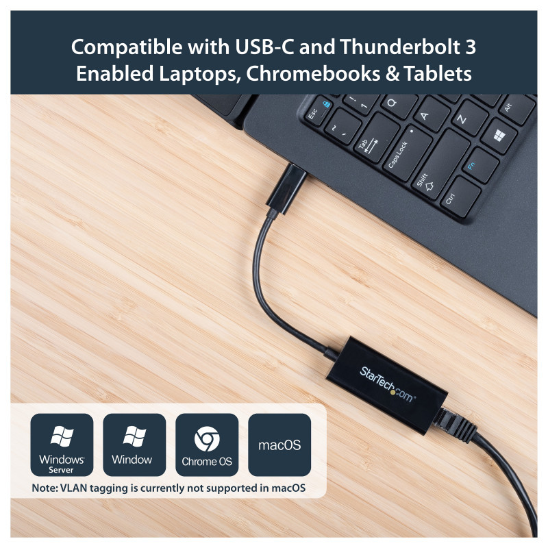 Simply plug the network adapter into the USB-C port on your laptop and connect to your network. The adapter's Realtek® RTL8153 chipset provides native driver support in Chrome OS™; macOS and Windows®.