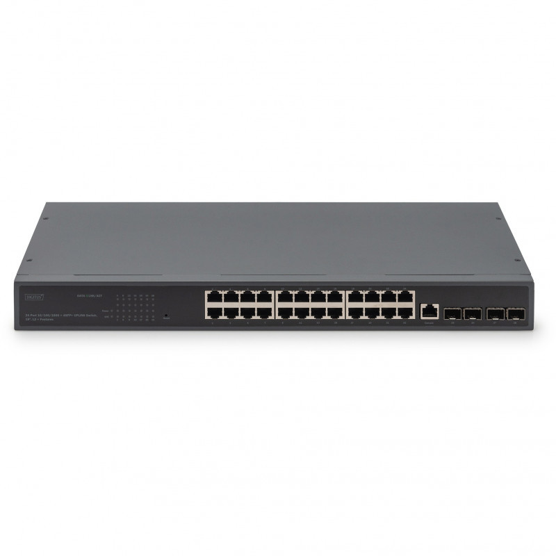 "Digitus 24 Port 10/100/1000 + 4SFP+ UPLINK Switch, 19"", L2+ Features. Switch type: Managed, Switch layer: L3. Basic switching RJ-45 Ethernet ports type: Gigabit Ethernet (10/100/1000), Basic switching RJ-45 Ethernet ports quantity: 24, Console port: RJ-45. MAC address table: 16000 entries, Switching capacity: 128 Gbit/s. Networking standards: IEEE 802.1D, IEEE 802.1Q, IEEE 802.1p, IEEE 802.1w, IEEE 802.1x, IEEE 802.3, IEEE 802.3ab, IEEE.... Rack mounting, Form factor: 1U"\n"24 Port 10/100/1000 + 4 10 G SFP+ UPLINK Switch, 19"", L2+ Features