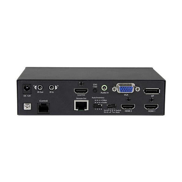 "StarTech.com Multi-Input HDBaseT Extender with Built-in Switch - DisplayPort, VGA and HDMI Over CAT5e or CAT6 - Up to 4K. Type: AV transmitter & receiver, Maximum resolution: 4096 x 2160 pixels, Cable types supported: Cat5e, Cat6. AC input voltage: 100 - 240 V, Operating voltage: 12 V, Input current: 0.6 A. Width: 160 mm, Depth: 100 mm, Height: 40 mm. Package width: 205 mm, Package depth: 298 mm, Package height: 62 mm. Cables included: LAN (RJ-45), Phone (RJ-11), Included power plug types: ANZ, EU, NA, UK"\n"Connect your laptop to a remote display over standard CAT5e or CAT6 cabling, and easily swap between HDMI, DP or VGA video sources