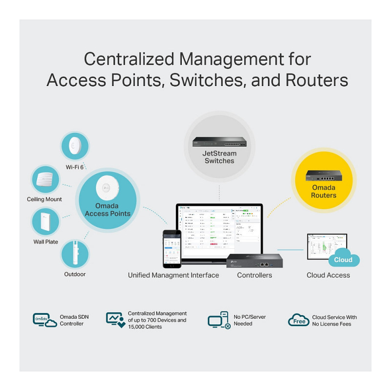 "TP-Link Omada Hardware Controller. Product colour: Black, Rack capacity: 1U. Processor manufacturer: ARM, Processor family: ARM Cortex, Internal memory: 2000 MB. Supported protocols: Routing/NAT/Session Limit/Bandwidth Control VPN (IPSec/L2TP/PPTP/OpenVPN) RADIUS.... Ethernet LAN data rates: 10,100,1000 Mbit/s, VPN support: VPN (IPSec/L2TP/PPTP/OpenVPN). Security algorithms: SNMP, SSH"\n"Centralized Management for