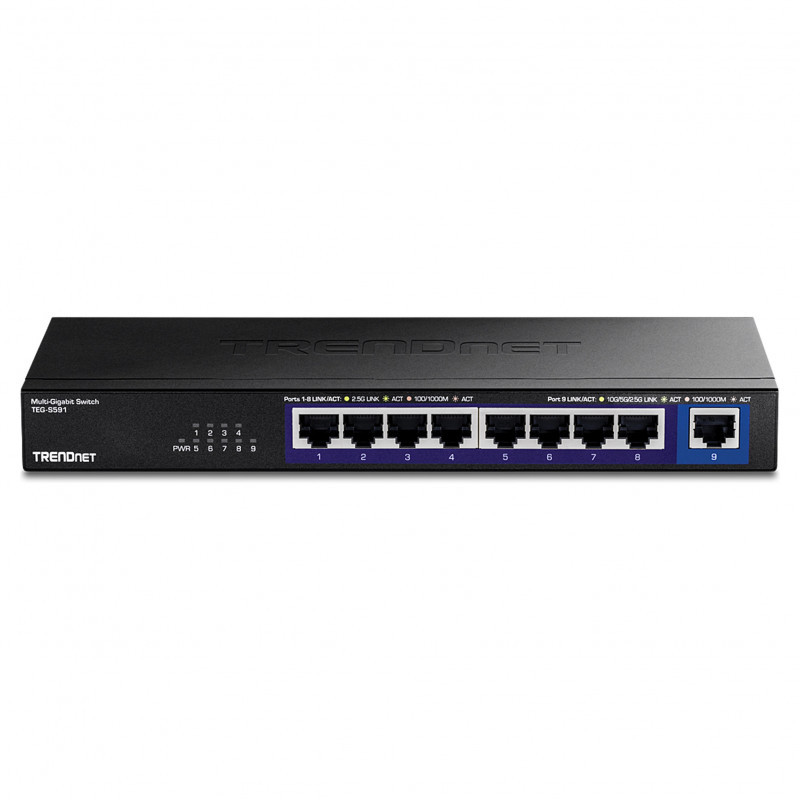 "Trendnet TEG-S591. Switch type: Unmanaged. Basic switching RJ-45 Ethernet ports type: 2.5G Ethernet (100/1000/2500), Basic switching RJ-45 Ethernet ports quantity: 8. Full duplex. MAC address table: 4000 entries, Switching capacity: 60 Gbit/s. Networking standards: IEEE 802.3ab, IEEE 802.3an, IEEE 802.3bz, IEEE 802.3u, IEEE 802.3x. Wall mountable"\n"Expand your network’s bandwidth and reduce traffic bottlenecks with TRENDnet’s high-speed and reliable Multi-Gigabit Switch. This multi-gig 2.5G / 10G switch comes equipped with 2.5G RJ-45 ports that provide speeds capable of up to 2.5Gbps over existing Cat5e or better cabling. It also offers one dedicated 10G RJ-45 port for an ultra-fast network connection, providing a cost-effective solution in adding 10G link capability to any SMB network. The fanless design on this multi-gigabit 2.5G / 10G switch lowers energy consumption and eliminates distracting operating noise. TRENDnet’s reliable multi-gigabit switches are cost-effective solutions to increase your network’s throughput."