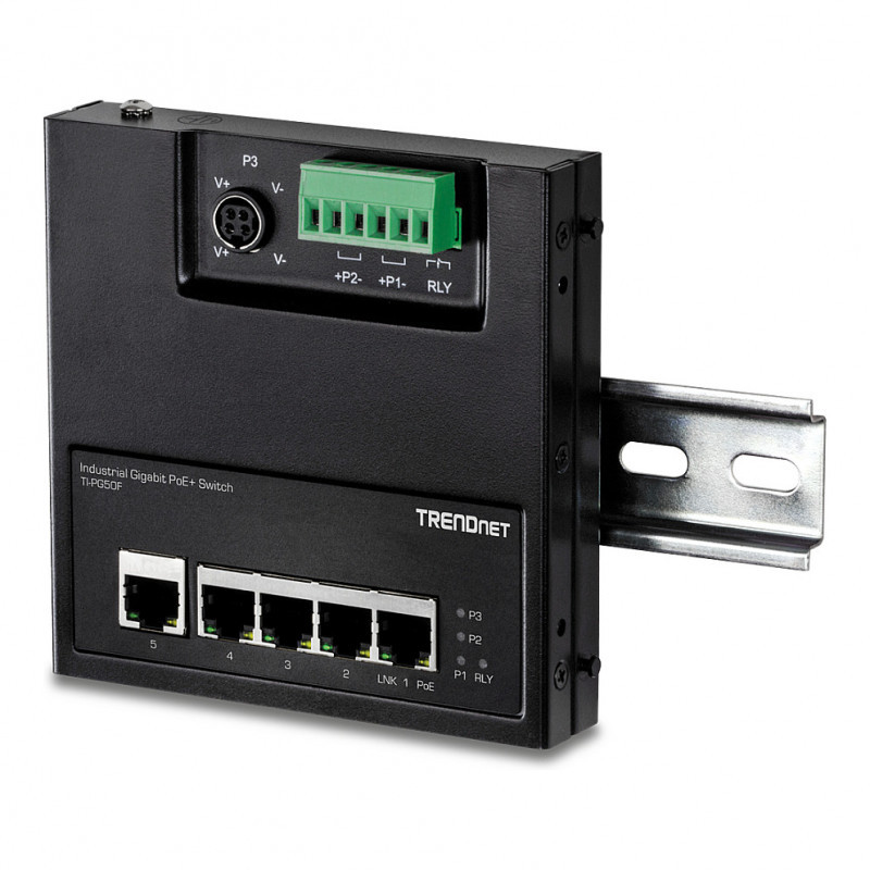 "Trendnet TI-PG50F. Switch type: Unmanaged. Basic switching RJ-45 Ethernet ports quantity: 5. MAC address table: 2000 entries, Switching capacity: 10 Gbit/s. Networking standards: IEEE 802.3, IEEE 802.3ab, IEEE 802.3af, IEEE 802.3at, IEEE 802.3u, IEEE 802.3x. Power over Ethernet (PoE)"\n"TRENDnet’s Industrial Gigabit PoE+ Wall-Mounted Front Access Switch Series are well suited for IP surveillance, IoT, and automation networks for homes and businesses. These hardened industrial gigabit flat switches provide front access to ports and power interfaces for easier installation. The flat and compact size make them ideal for cabinet installations where space is limited. Each hardened industrial front access switch features gigabit PoE+ ports for connecting devices such as wireless access points, IP cameras, and IoT appliances. These hardened front access switches come equipped with an IP30 rated metal enclosure, designed to withstand a high degree of vibration and shock, while operating within a wide temperature range of -40° – 75° C (-40° – 167° F) for industrial environments.