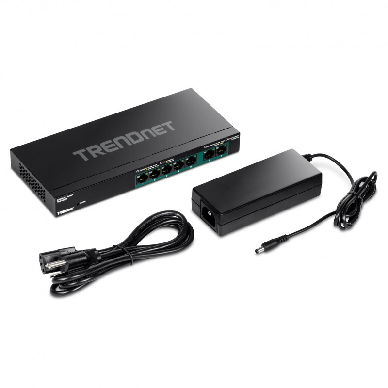 "Trendnet TPE-TG327. Switch type: Unmanaged. Basic switching RJ-45 Ethernet ports type: Gigabit Ethernet (10/100/1000), Basic switching RJ-45 Ethernet ports quantity: 5. MAC address table: 2000 entries, Switching capacity: 20 Gbit/s. Networking standards: IEEE 802.3ab, IEEE 802.3af, IEEE 802.3at, IEEE 802.3bz, IEEE 802.3x, IEEE 802.3z. DC input voltage: 55 V. Power over Ethernet (PoE). Wall mountable"\n"TRENDnet’s 7-Port Multi-Gig PoE+ Switch, model TPE-TG327, is an affordable 2.5G PoE+ switch that provides advanced high-bandwidth performance, ease of use, and reliability. The TPE-TG327 multi-gig switch offers two dedicated 2.5G PoE+ ports and five dedicated 1G PoE+ ports for high-speed network connections with a 20Gbps switching capacity. Having a sturdy compact metal housing and fanless design, the multi-gig PoE+ switch is a cost-effective solution for high-speed network connections. A 70W total PoE power budget on this affordable multi-gig PoE+ switch supplies up to seven PoE+ devices with up to 30W per port."