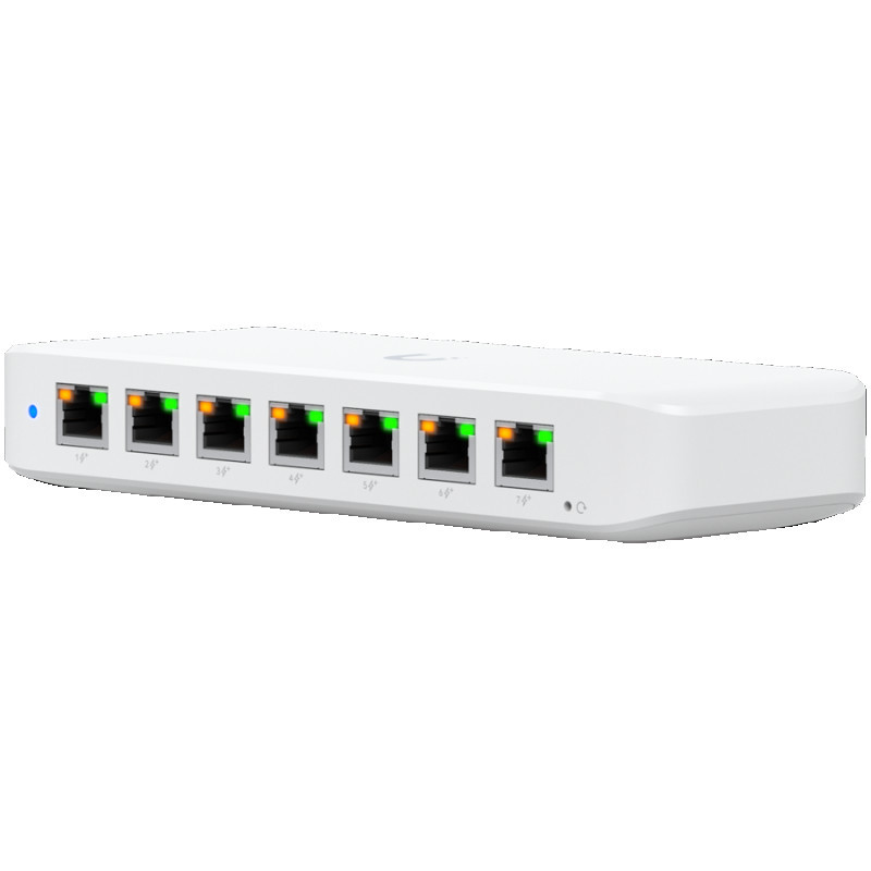 Ubiquiti USW-Ultra-210W-EU compact, Layer 2, 8-port GbE PoE switch with versatile mounting options, 7x GbE PoE+ output ports, GbE port with optional PoE++ input, 202W PoE availability with the included AC power adapter