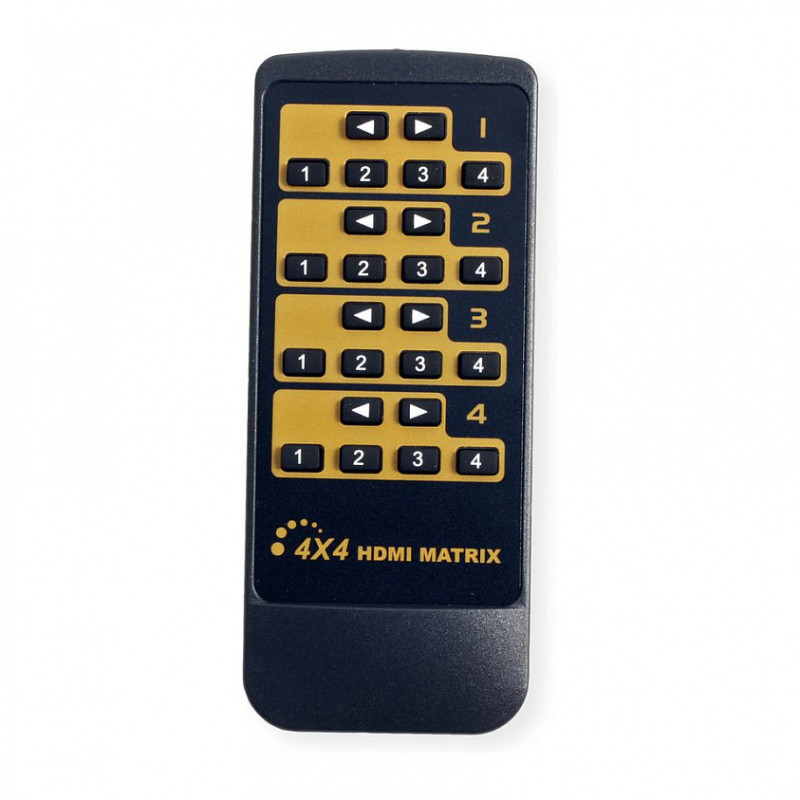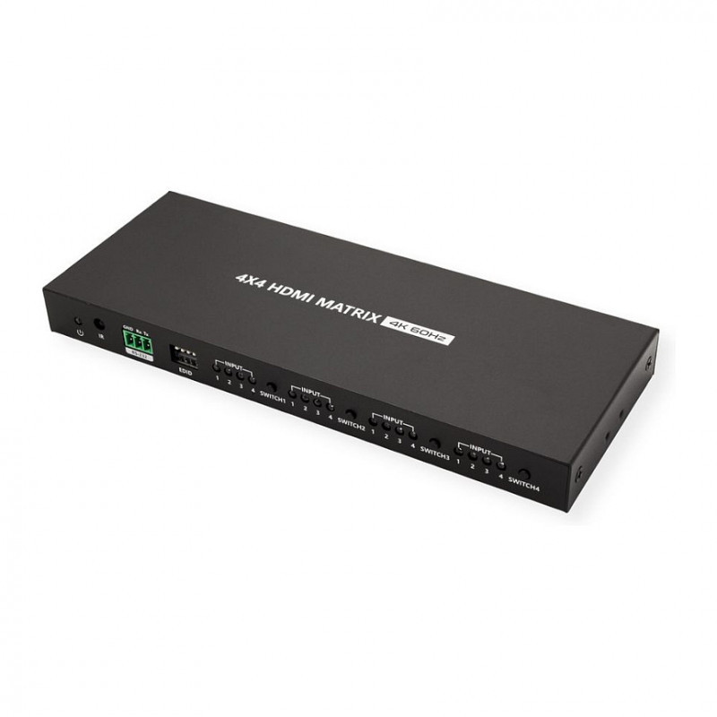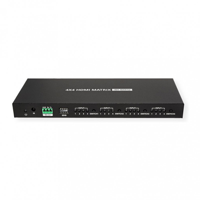 This 4 in 4 out HDMI Matrix can switch 4 HDMI input signals (PC, notebook, etc.) to 4 HDMI displays (monitor, projector, etc.) with resolutions up to 4096x2160@60Hz. It supports multiple switching methods (buttons on the matrix, IR remote control and RS232). Any two of the four HDMI outputs support automatic down-scaling. This matrix can be used in security surveillance, education, training, exhibitions, trade shows, broadcasting, command centers and many other applications.