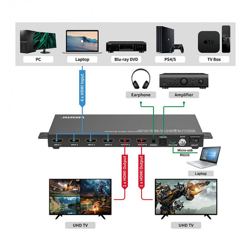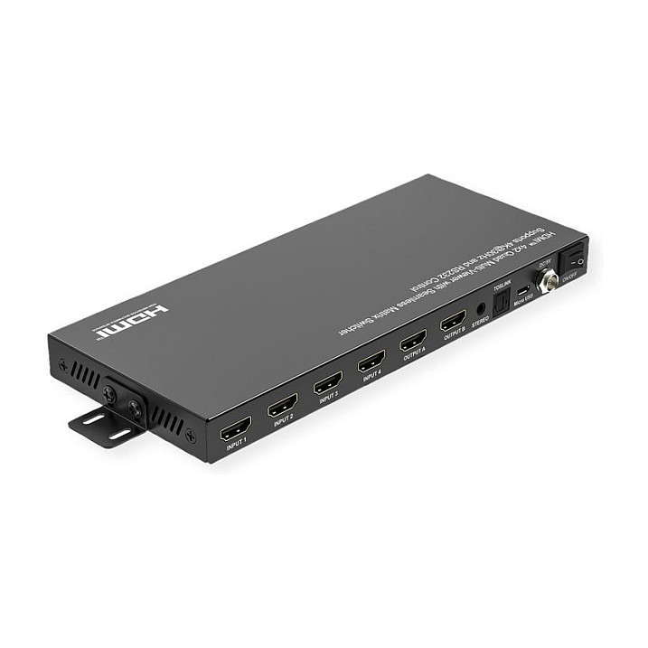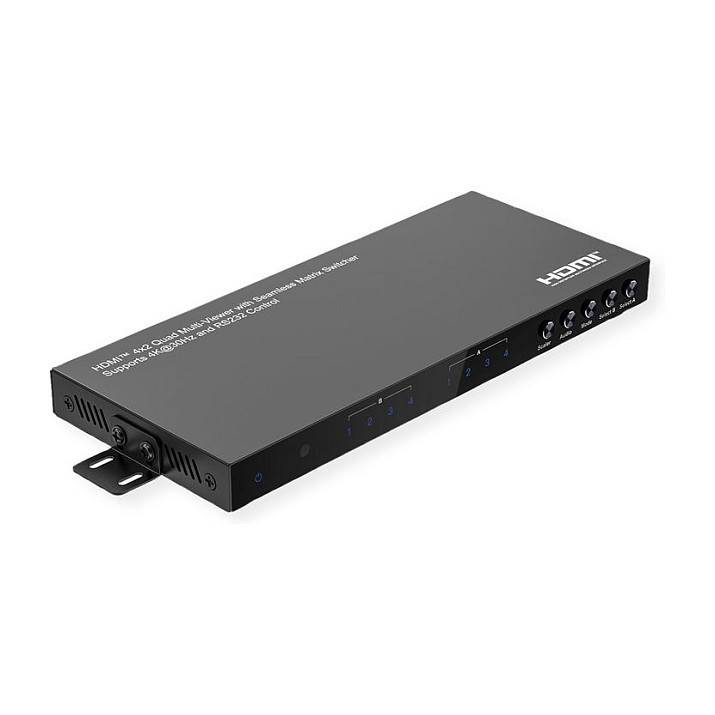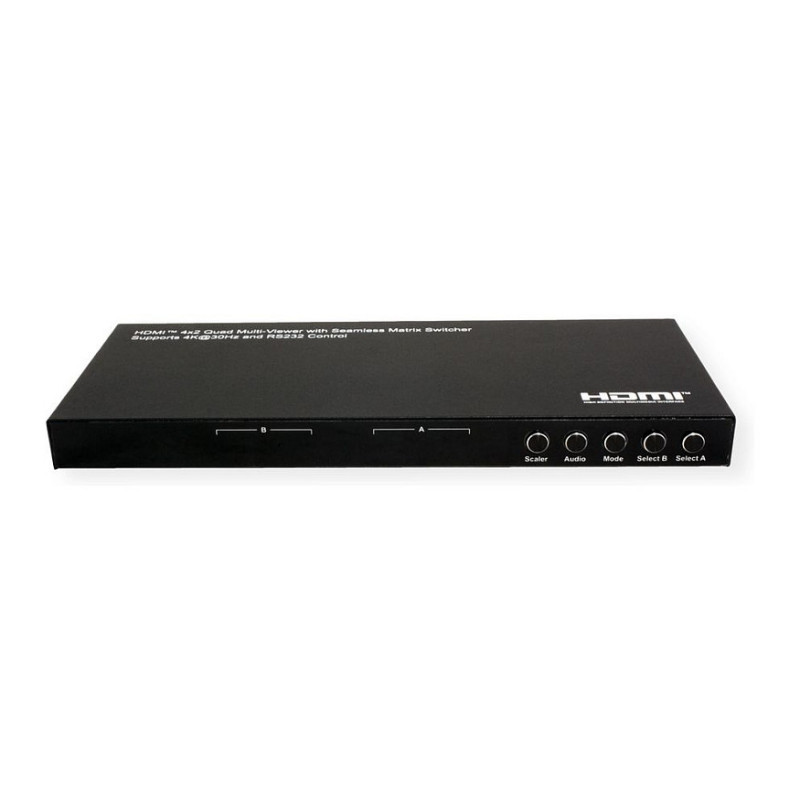 This VALUE HDMI 4x2 Matrix, 4K30Hz Quad Multi Viewer supports four HDMI input sources that can be displayed on one screen with five multi-view modes. The four HDMI inputs can be switched seamlessly. You can control it via the front button, IR control and RS-232 control.
