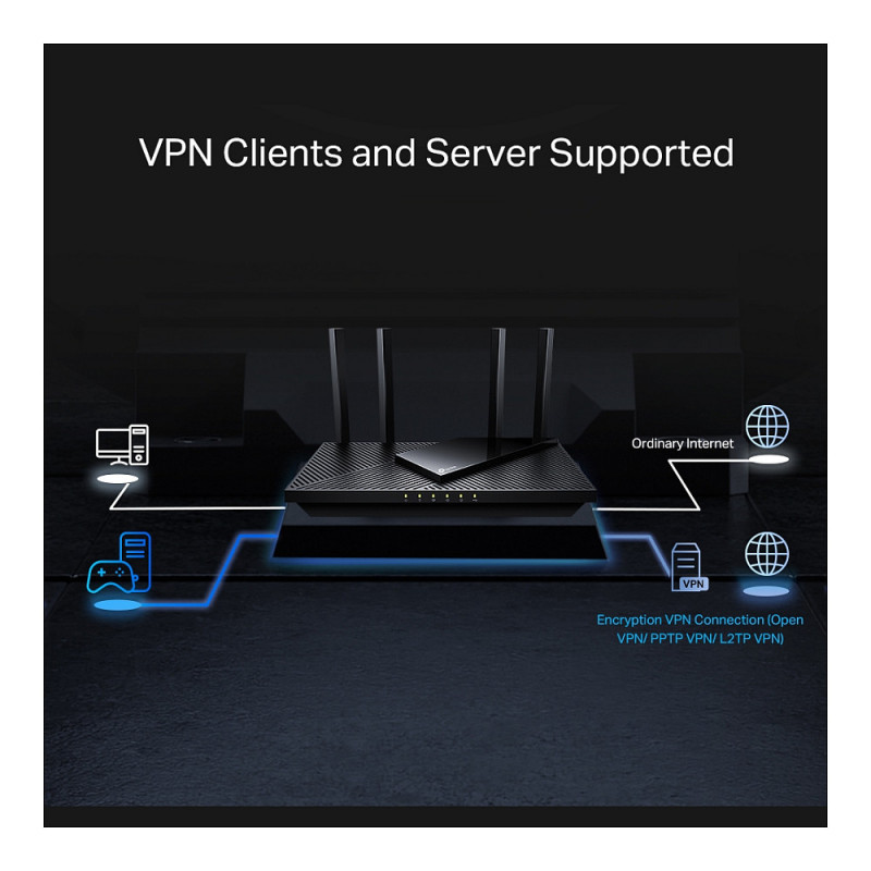 "TP-Link Archer AX3000 Multi-Gigabit Wi-Fi 6 Router with 2.5G Port. WAN connection type: RJ-45. Wi-Fi band: Dual-band (2.4 GHz / 5 GHz), Top Wi-Fi standard: Wi-Fi 6 (802.11ax), WLAN data transfer rate (max): 2402 Mbit/s. Ethernet LAN interface type: Gigabit Ethernet, Networking standards: IEEE 802.11a, IEEE 802.11ac, IEEE 802.11ax, IEEE 802.11b, IEEE 802.11g, IEEE 802.11n, VPN server: OpenVPN, PPTP, L2TP. Security algorithms: WPA, WPA2, WPA3, Firewall security: SPI Firewall, NAT functionality: • Port Forwarding • Port Triggering • DMZ • UPnP. Product type: Desktop/pole router, Product colour: Black"\n"The New Era of Connectivity with 2.5G Ports