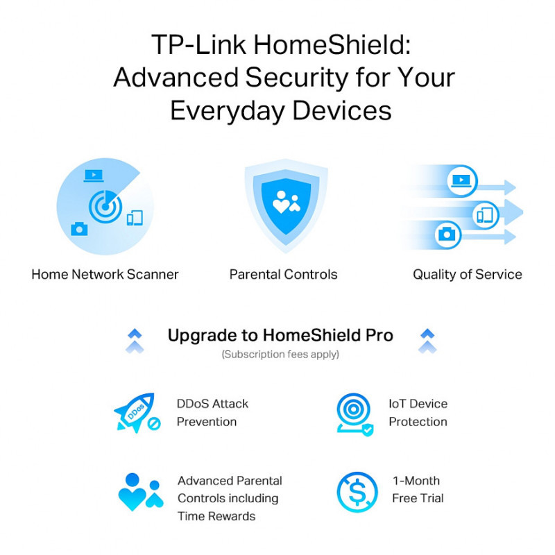 With TP-Link HomeShield, enjoy advanced security features dealivering a safe environment that protects your family and network's data and privacy.