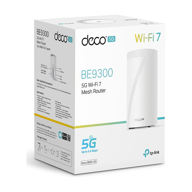 "TP-Link 5G BE9300 Whole Home Mesh Wi-Fi 7 Router, Build-In 5G Modem. Product colour: White, Antenna type: External, Product type: Mesh system. Wi-Fi band: Tri-band (2.4 GHz / 5 GHz / 6 GHz), Top Wi-Fi standard: Wi-Fi 7 (802.11be), WLAN data transfer rate (max): 9214 Mbit/s. Mobile network generation: 5G, 5G standard: Sub6, SIM card type: NanoSIM. Virtual assistant: Amazon Alexa & Google Assistant, Parental control features: Content filter, SafeSearch, Time controls, Youtube restriction, Operating modes: Router, AP. Ethernet LAN data rates: 100,1000,2500 Mbit/s"\n"Cutting-Edge 5G,