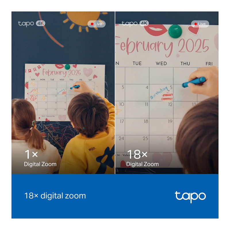 "TP-Link Tapo Pan/Tilt AI Home Security Wi-Fi Camera. Type: IP security camera, Placement supported: Indoor, Connectivity technology: Wireless. Mounting type: Ceiling/Wall/Desk, Product colour: White. Field of view (FOV) angle: 98°, Lens viewing angle, horizontal: 91.5°, Lens viewing angle, vertical: 46.1°. Sensor type: CMOS, Optical sensor size: 25.4 / 2.7 mm (1 / 2.7""). Digital zoom: 18x, Lens diameter: 6.9 mm, Focal length range: 4.3 mm"\n"Tapo 4K Clarity, Every Detail, Every Moment, Captured.