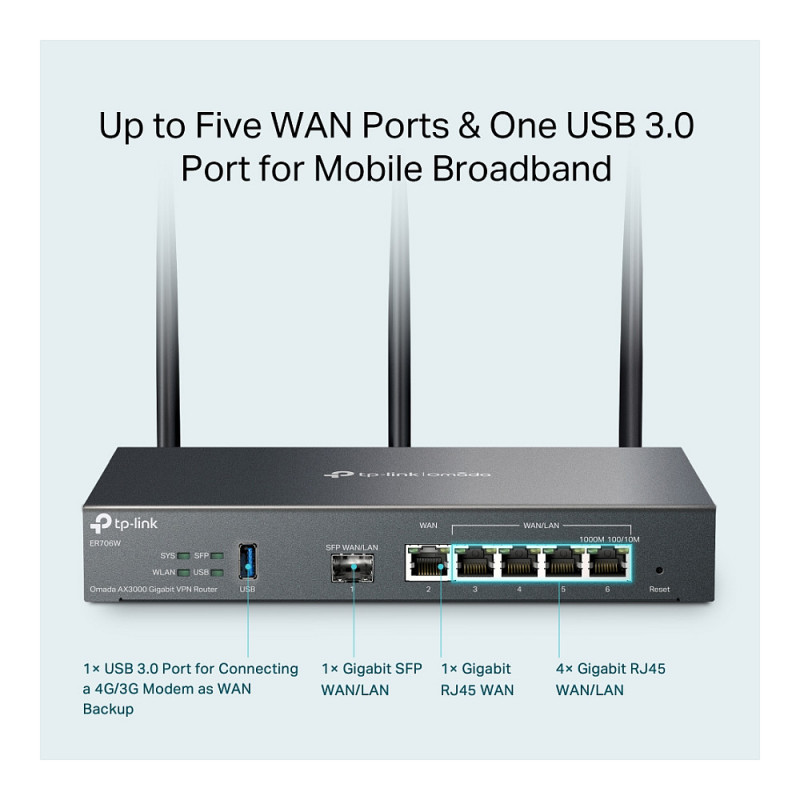 "TP-Link Omada AX3000 Gigabit VPN Router. WAN connection type: SFP. Wi-Fi band: Dual-band (2.4 GHz / 5 GHz), WLAN data transfer rate (max): 3000 Mbit/s, WLAN data transfer rate (first band): 574 Mbit/s. Ethernet LAN interface type: Gigabit Ethernet, Ethernet LAN data rates: 10,100,1000 Mbit/s, Cabling technology: 10/100/1000Base-T(X). Security algorithms: WPA, WPA2, WPA3-Enterprise. Routing protocols: OSPF, RIP"\n"Flexible Wi-Fi Coverage through Business Wired Connectivity