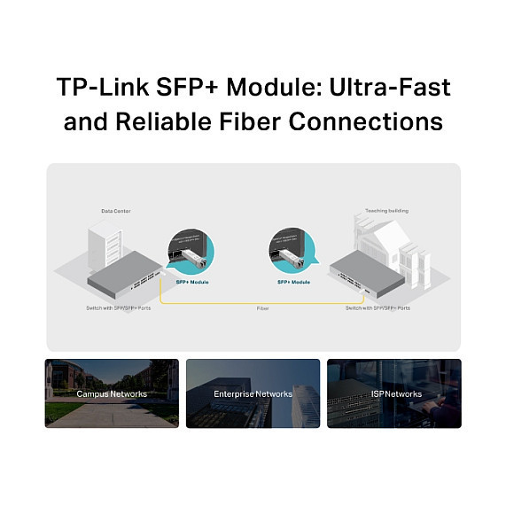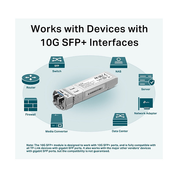 "TP-Link SM5110-LR. SFP transceiver type: Fiber optic, Maximum data transfer rate: 10000 Mbit/s, Interface type: SFP+. Input voltage: 3.3 V. Width: 56.7 mm, Depth: 13.9 mm, Height: 10.3 mm. Quantity per pack: 8 pc(s)"\n