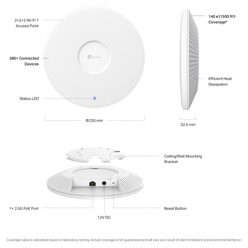 "TP-Link Omada BE9300 Ceiling Mount Tri-Band Wi-Fi 7 Access Point. 2.4 GHz, 5 GHz, 6 GHz, Maximum data transfer rate: 9300 Mbit/s. Security algorithms: SNMP, SNMPv2, SNMPv3, WPA-Enterprise, WPA-Personal, WPA2-Enterprise, WPA2-Personal,.... Ethernet LAN data rates: 2500 Mbit/s. Product colour: White"\n"Ultra-Thin Enterprise WiFi 7 Access Point