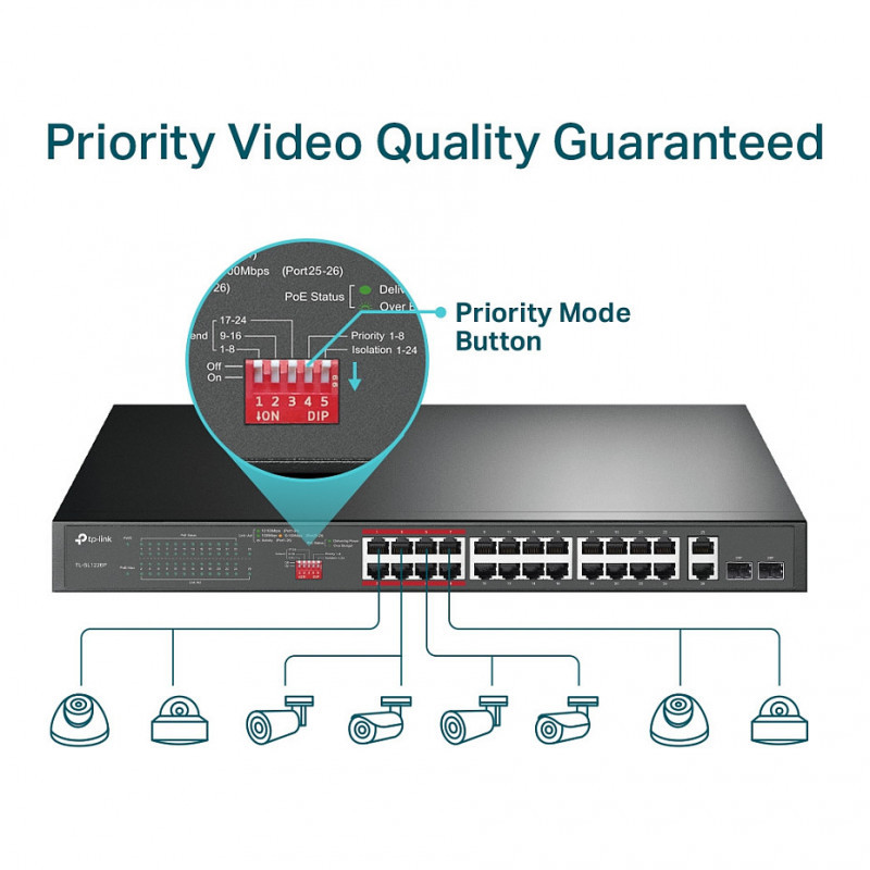 Quality of sensitive applications like video monitoring in critical business areas is guaranteed by offering higher priority options for ports 1–8 when one-touch Priority Mode is on.