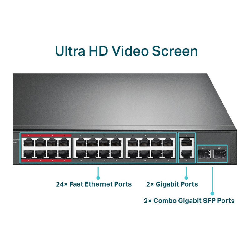 "TP-Link 24-Port 10/100Mbps + 2-Port Gigabit Unmanaged PoE+ Switch. Switch type: Unmanaged. Basic switching RJ-45 Ethernet ports type: Gigabit Ethernet (10/100/1000), Basic switching RJ-45 Ethernet ports quantity: 26. MAC address table: 8000 entries, Switching capacity: 8.8 Gbit/s. Networking standards: IEEE 802.3af, IEEE 802.3at, IEEE 802.3x. Power over Ethernet (PoE). Rack mounting, Form factor: 1U"\n"Professional High Power 24-Port PoE+ Switch