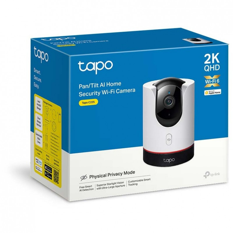 "TP-Link Tapo Pan/Tilt AI Home Security Wi-Fi Camera. Type: IP security camera, Placement supported: Indoor, Connectivity technology: Wireless. Mounting type: Desk, Product colour: Black, White, Form factor: Tower. Field of view (FOV) angle: 360°, Angle of rotation: 360°, Tilt angle range: 0 - 149°. Sensor type: Starlight, Optical sensor size: 25.4 / 3 mm (1 / 3""), Effective sensor resolution: 1440 pixels. Fixed focal length: 4 mm"\n"Smart. Secure. Easy.