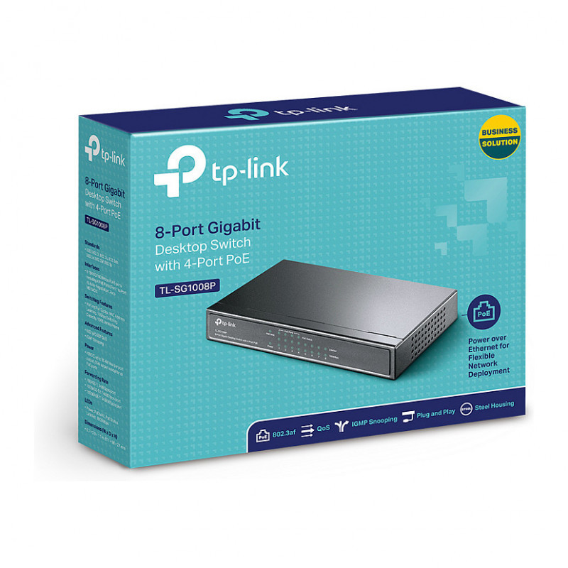 "TP-Link 8-Port Gigabit Desktop PoE Switch with 4-Port. Switch type: Managed. Basic switching RJ-45 Ethernet ports type: Gigabit Ethernet (10/100/1000), Basic switching RJ-45 Ethernet ports quantity: 8. MAC address table: 4000 entries, Switching capacity: 16 Gbit/s. Networking standards: IEEE 802.1p, IEEE 802.3, IEEE 802.3ab, IEEE 802.3af, IEEE 802.3i, IEEE 802.3u, IEEE 802.3x. DC input voltage: 53.5 V. Power connector: DC-in jack. Power over Ethernet (PoE)"\n"PoE Switches for Your Ultra Convenience