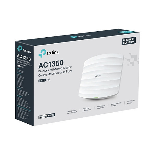 "TP-Link FESTA F52. 2.4 GHz, 5 GHz, Maximum data transfer rate: 867 Mbit/s. Security algorithms: WPA, WPA2. Power over Ethernet (PoE). Product colour: White"\n"Festa offers business-class features with consumer-inspired simplicity. Our free cloud-based centralized management is accessible via the Festa app or web, providing essential features for small businesses without the complexity required by larger-scale operations.