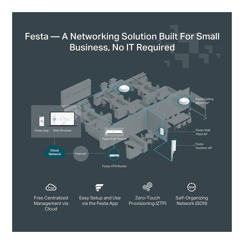 "TP-Link FESTA FR365. WAN connection type: RJ-45. Wi-Fi band: Dual-band (2.4GHz + 5GHz or 2.4GHz + 6GHz), Top Wi-Fi standard: Wi-Fi 6 (802.11ax), WLAN data transfer rate (max): 2402 Mbit/s. Ethernet LAN interface type: Gigabit Ethernet, Networking standards: IEEE 802.11ac, IEEE 802.11ax, IEEE 802.11n. Security algorithms: SNMP, SNMPv2, SNMPv3, WPA, WPA2, WPA3. Product type: Tabletop router, Product colour: White"\n"Festa 一 A Networking Solution Built For Small Business, No IT Required