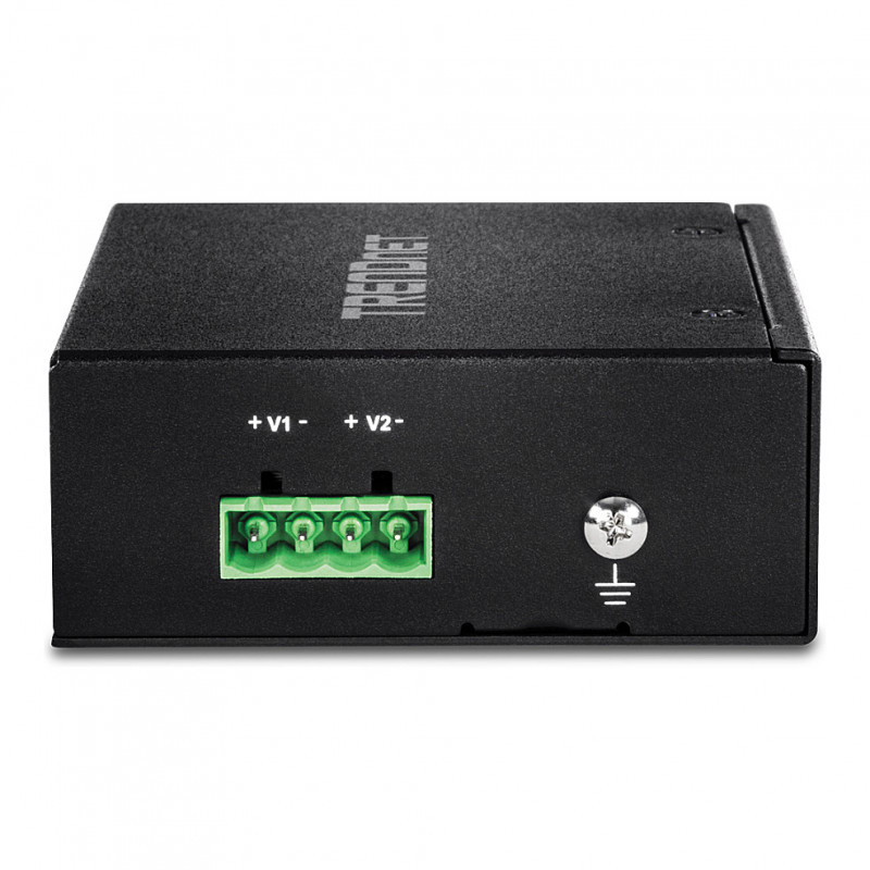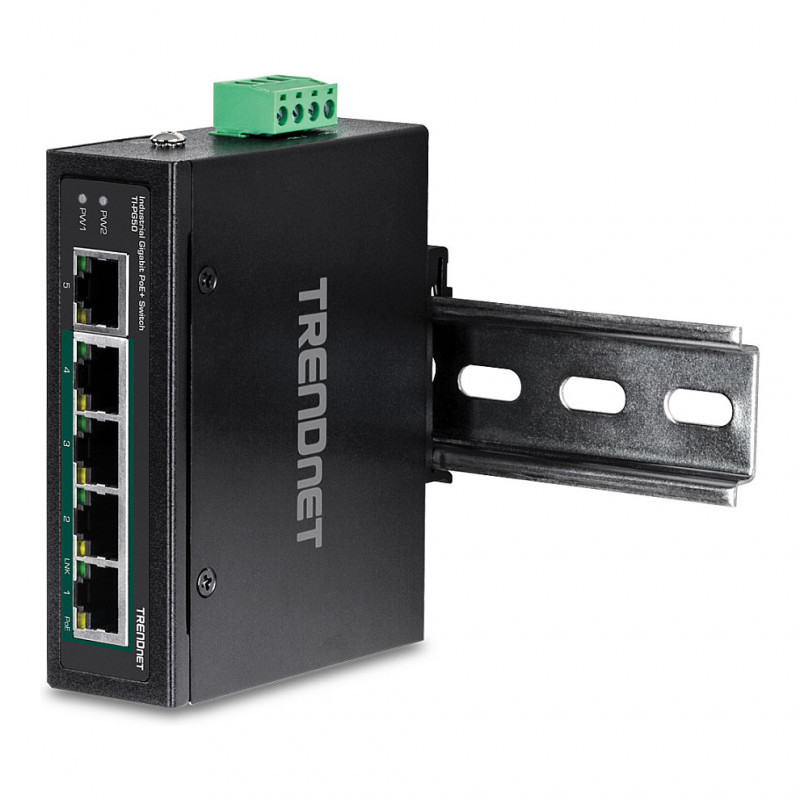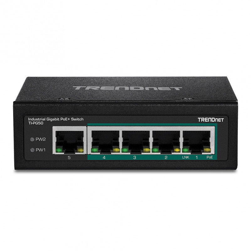 "Trendnet TI-PG50. Switch type: Unmanaged. Basic switching RJ-45 Ethernet ports type: Gigabit Ethernet (10/100/1000), Basic switching RJ-45 Ethernet ports quantity: 4. Full duplex. MAC address table: 2000 entries, Switching capacity: 10 Gbit/s. Networking standards: IEEE 802.3, IEEE 802.3ab, IEEE 802.3af, IEEE 802.3at, IEEE 802.3u, IEEE 802.3x. DC input voltage: 48 - 56 V. Power over Ethernet (PoE). Wall mountable, Rack mounting"\n"TRENDnet’s 5-Port Industrial Gigabit PoE+ DIN-Rail Switch, model TI-PG50, has four gigabit PoE+ ports with a 120W PoE power budget. Users are able to connect four PoE+ devices to this industrial switch, while simultaneously providing a non-PoE gigabit port for connectivity to the network. The TI-PG50 industrial switch is equipped with an IP30 rated metal enclosure, designed to withstand a high degree of vibration and shock, while operating within a wide temperature range of -40° – 75° C (-40° – 167° F) for industrial environments.
