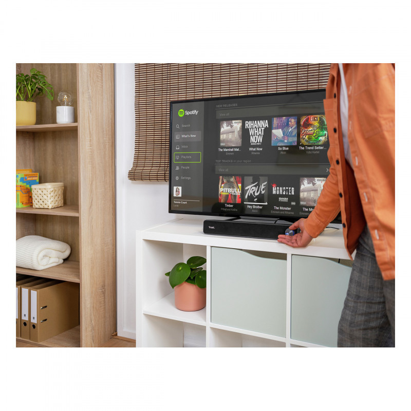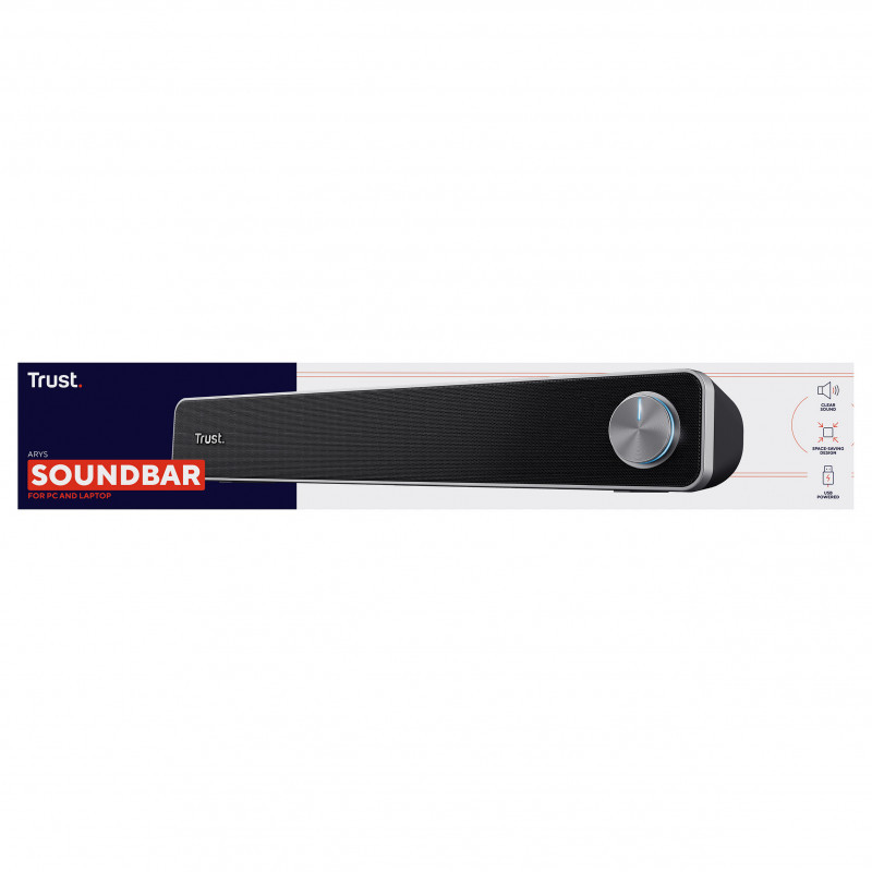 "Trust Arys. Audio output channels: 2.0 channels, RMS rated power: 6 W, Peak Music Power Output (PMPO): 12 W. Soundbar speaker RMS power: 6 W, Impedance: 4 Ω. Product colour: Black. Connectivity technology: Wired. Power consumption (typical): 5 W"\n"Soundbar with refined design and 12 Watt (6W RMS) output power.