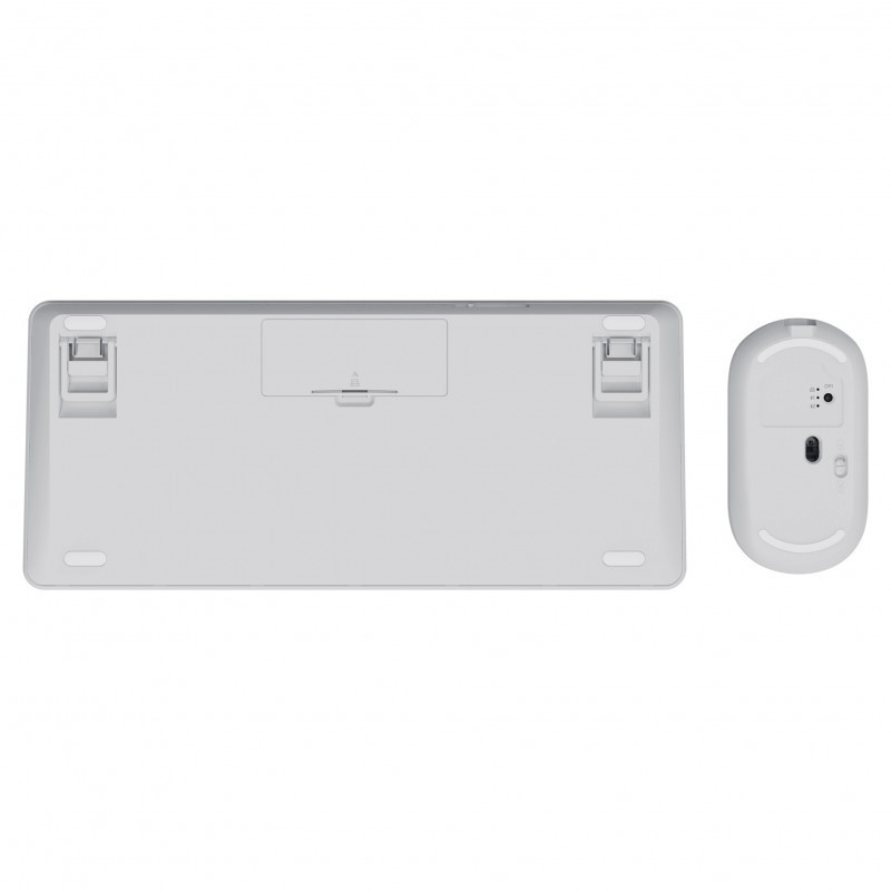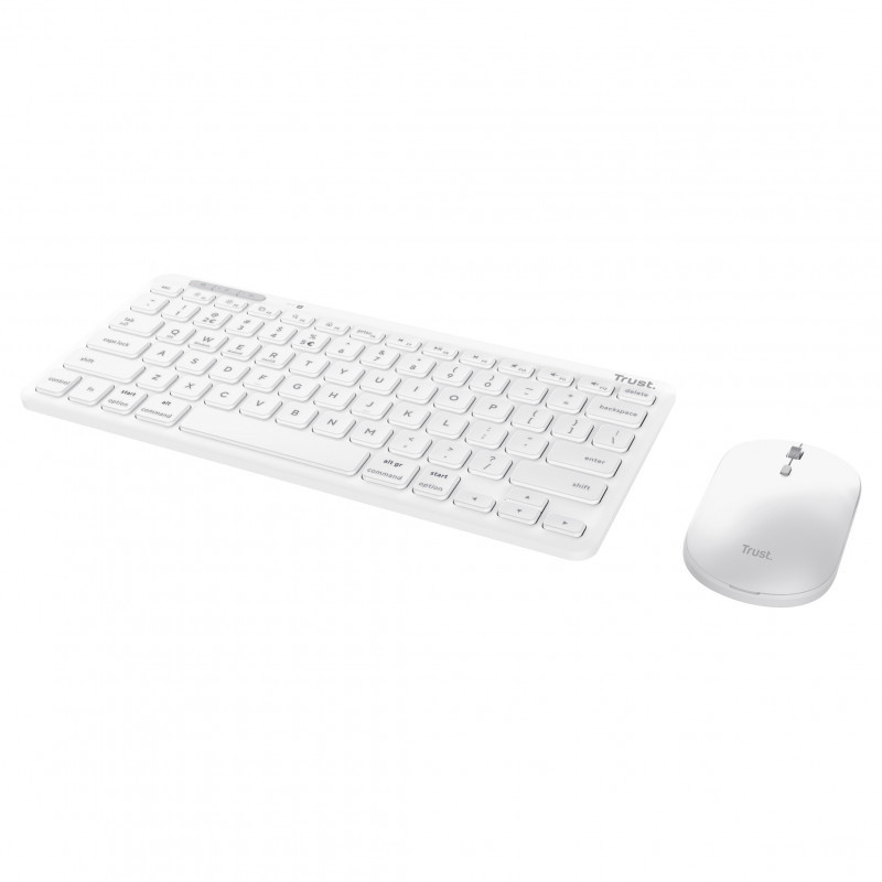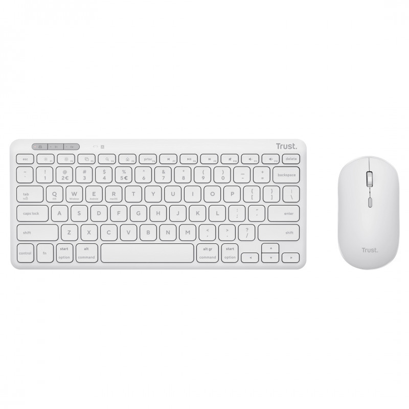 "Trust Lyra Multi-Device Wireless Keyboard & Mouse. Keyboard form factor: Mini. Keyboard style: Straight. Connectivity technology: Wireless, Device interface: RF Wireless + Bluetooth, Keyboard key switch: Scissor key switch, Keyboard layout: QWERTZ, Recommended usage: Office. Product colour: White. Mouse included"\n"Multi-Device Wireless Keyboard & Mouse