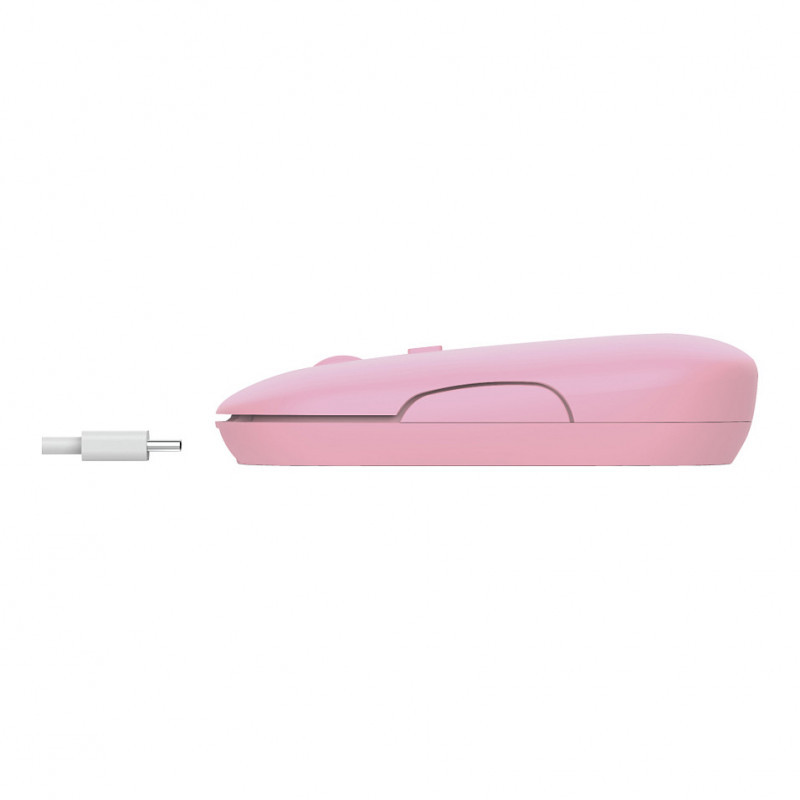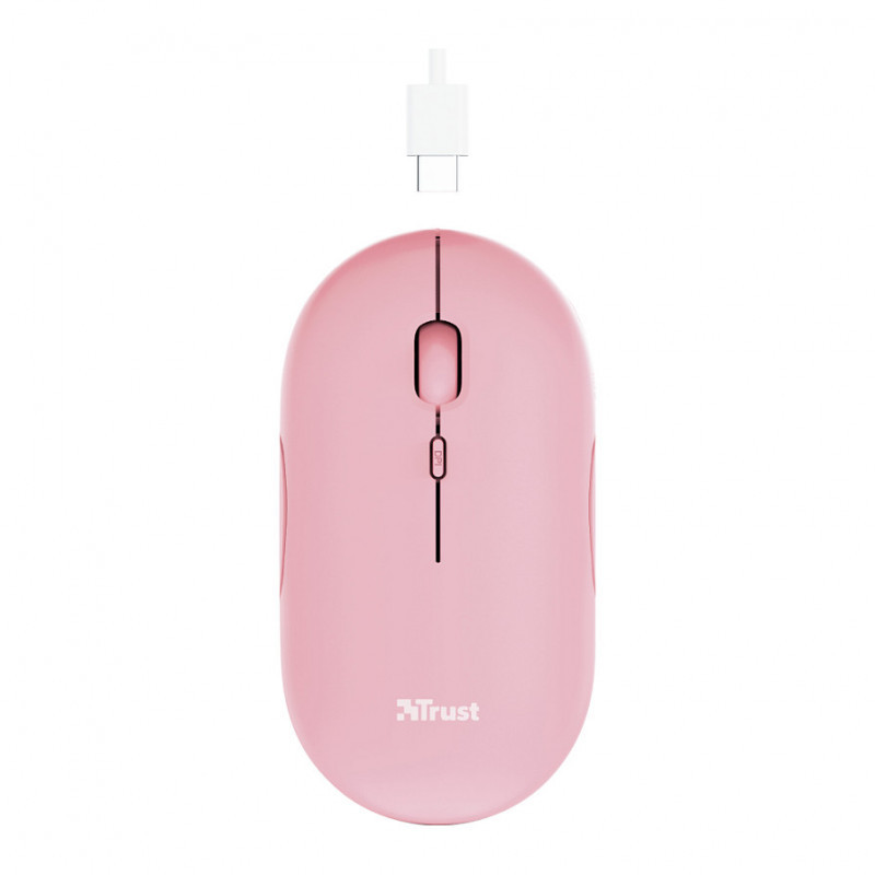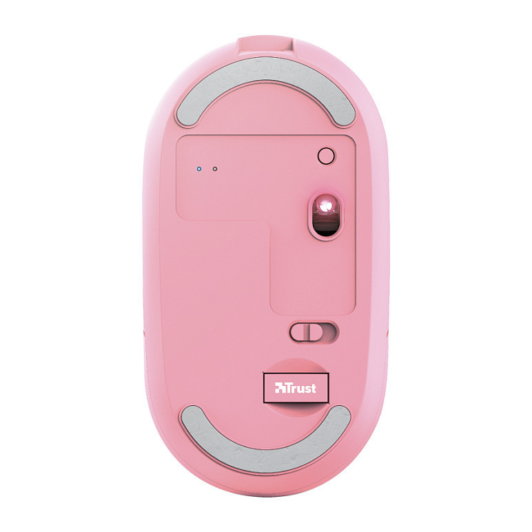 "Trust Puck. Form factor: Ambidextrous. Movement detection technology: Optical, Device interface: RF Wireless + Bluetooth, Movement resolution: 1600 DPI, Buttons type: Pressed buttons, Buttons quantity: 4, Scroll type: Wheel. Power source: Batteries. Product colour: Pink"\n"Minimalistic Design, Maximum Features