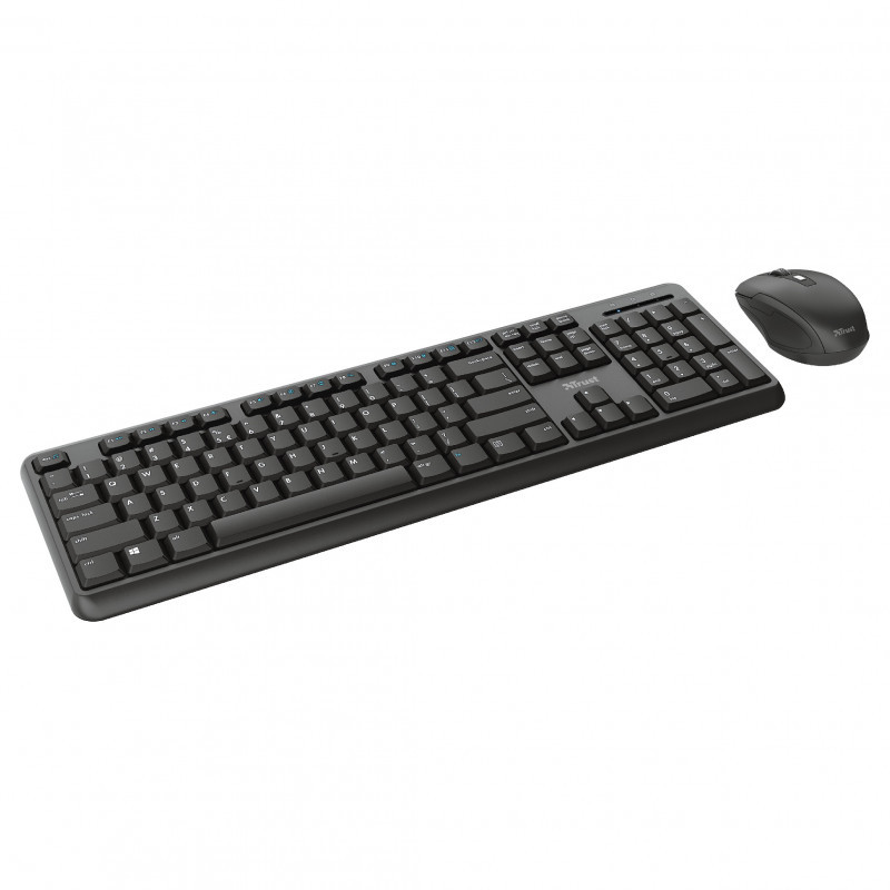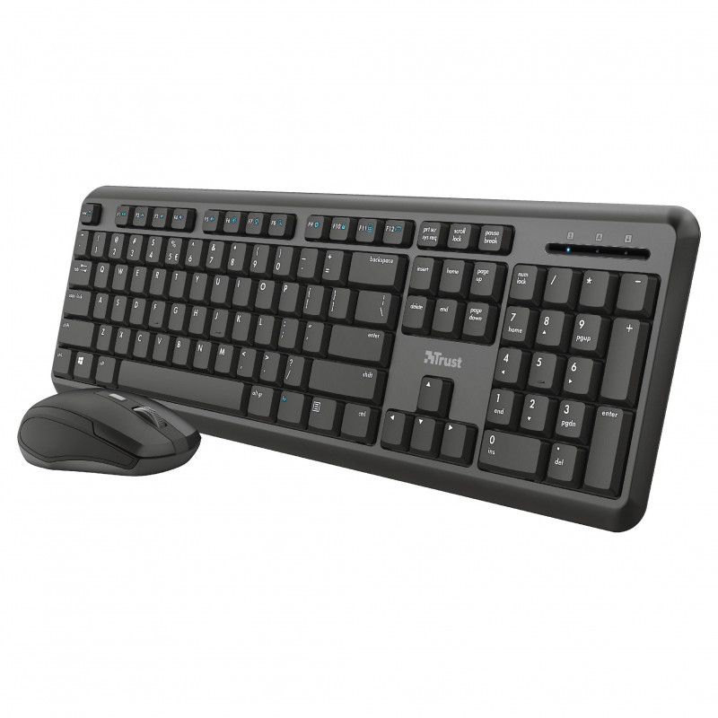 "Trust TKM-350. Keyboard form factor: Full-size (100%). Keyboard style: Straight. Connectivity technology: Wireless, Device interface: RF Wireless, Keyboard key switch: Membrane, Keyboard layout: QWERTZ, Recommended usage: Office. Product colour: Black. Mouse included"\n"TKM-350 Wireless Keyboard and Mouse Set