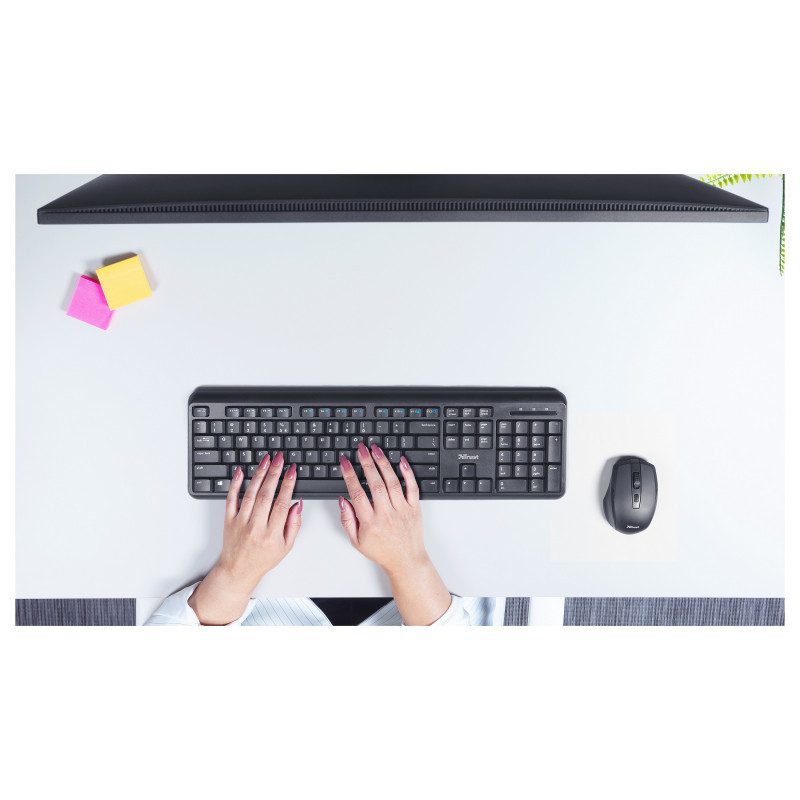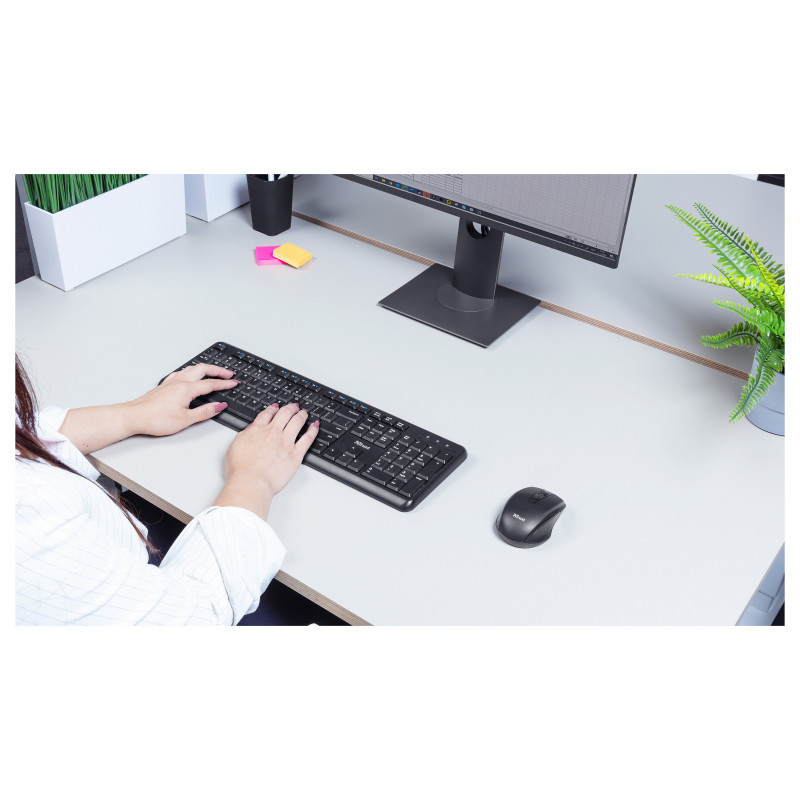 The Trust TKM-350 Silent Wireless Keyboard with Mouse is the right combo to make your work more comfortable than before. The silent keys prevent others from being disturbed by your work, the keyboard itself is spill resistant, and thanks to this set being wireless it will provide plenty of flexibility. It even comes in easy-to-open and sustainable packaging, made of 100% recycled material, that saves both the environment and time.