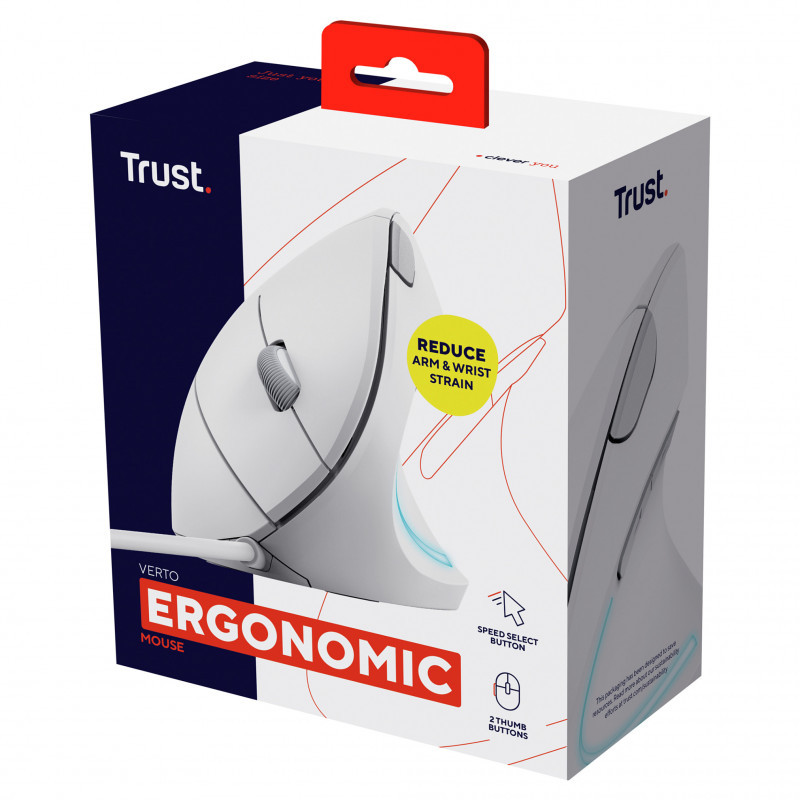 "Trust Verto. Form factor: Right-hand, Vertical design. Movement detection technology: Optical, Device interface: USB Type-A, Movement resolution: 1600 DPI, Buttons type: Pressed buttons, Buttons quantity: 6, Scroll type: Wheel. Illumination colour: Blue. Power source: Cable. Product colour: White"\n"Mouse with ergonomic vertical design to reduce arm and wrist strain
