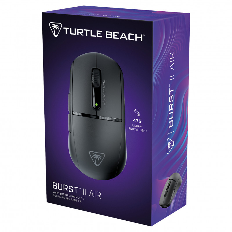 "Turtle Beach Burst II Air Black – 2.4GHz Wireless Gaming Mouse: 47g Ultra Lightweight, Optical Switches, 26K DPI Optical Sensor, Bluetooth, 120h battery. Form factor: Right-hand. Movement detection technology: Optical, Device interface: RF Wireless + Bluetooth, Movement resolution: 26000 DPI, Buttons type: Pressed buttons, Scroll type: Wheel, Acceleration (max): 50 G. Power source: Batteries. Product colour: Black"\n"The Turtle Beach® Burst II Air ultra-lightweight 2.4GHz wireless gaming mouse satisfies your need for speed at an incredible, best-in-class 47g. Designed for quick flick shots and the fastest players with a smooth yet precise Owl-Eye™ 26K DPI sensor with 650 IPS (16.5m/s) tracking speed, and blazing TITAN Optical Switches with adjustable debounce provides a long-lasting 100 million click life cycle, click tensioning and speed-of-light actuation for unprecedented speed and precision. The dual wireless system features 2.4GHz wireless for gaming (up to 40 hours of continuous use) and convenient Bluetooth® versatility (up to 120 hours) all in a right-handed symmetrical, solid top shell design. "