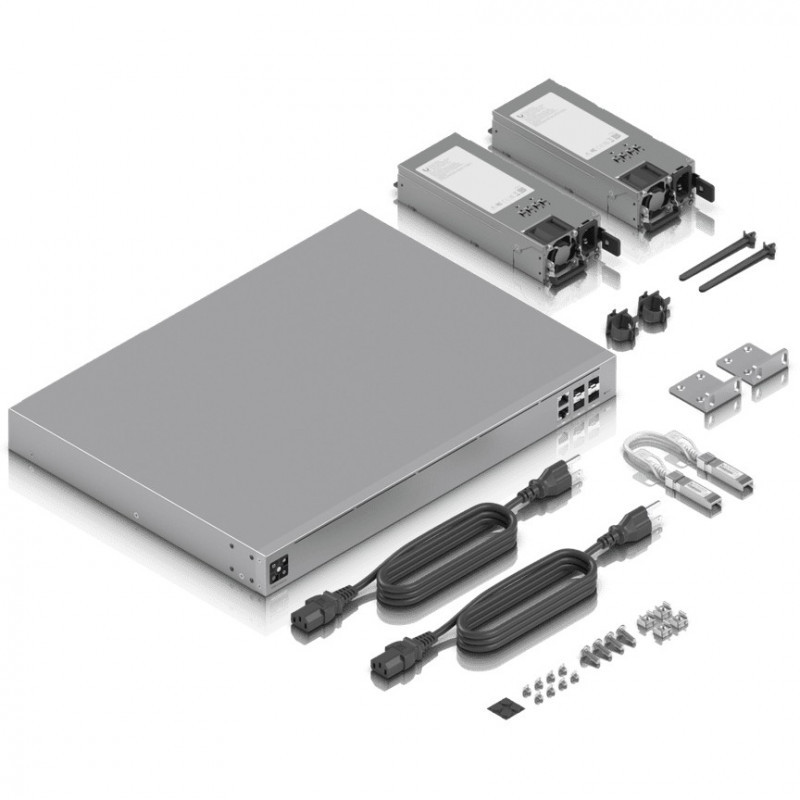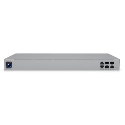 "Ubiquiti UXG-Enterprise. Product colour: Grey, Rack capacity: 1U, Enclosure material: Aluminium/SGCC. Processor manufacturer: ARM, Processor family: ARM Cortex, Internal memory: 16000 MB. Ethernet LAN data rates: 2500,10000,25000 Mbit/s, VPN support: Teleport Zero-Configuration VPN ✓ WireGuard ✓ OpenVPN ✓ L2TP ✓. Power consumption (max): 82 W, Input voltage: 100 - 240 V, Input frequency: 50 - 60 Hz. Width: 442.4 mm, Depth: 325 mm, Height: 43.7 mm"\n