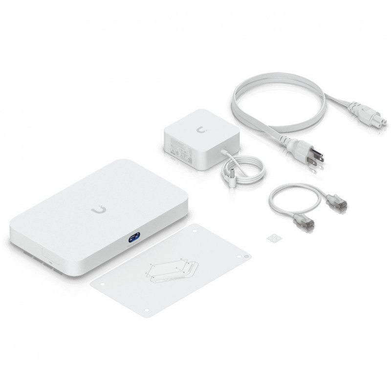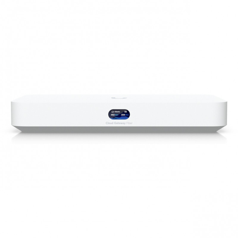 "Ubiquiti UCG-Fiber (30W). Product colour: White, Enclosure material: Polycarbonate (PC), LED indicators: Status. Display type: LCM, Processor manufacturer: ARM, Processor family: ARM Cortex. Routing protocols: OSPF. Ethernet LAN data rates: 10,100,1000,2500,10000 Mbit/s. Security algorithms: 802.1x RADIUS, IPSec, TLS"\n"Desktop 10G Cloud Gateway with integrated 4-port 2.5 GbE switch, selectable NVR storage, and full UniFi application support."