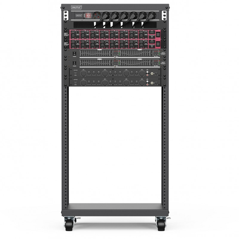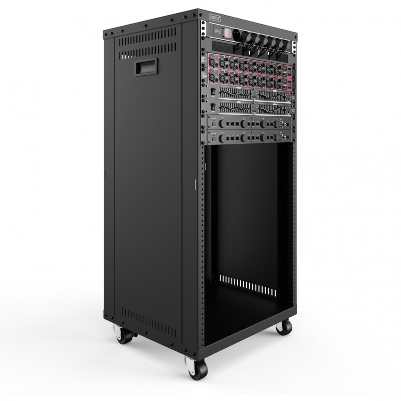 "Digitus Universal 19-Inch Equipment Rack with Castors, 21U. Type: Freestanding rack, Rack capacity: 21U, Maximum weight capacity: 136 kg, Castor wheels. Weight: 17.2 kg. Product colour: Black"\n"The 19-inch racks from DIGITUS® can be used universally thanks to their 19-inch thread perforation. Audiovisual accessories (AVS) or active and passive network components can be installed in the blink of an eye. Compatible with US or EU screw sizes
