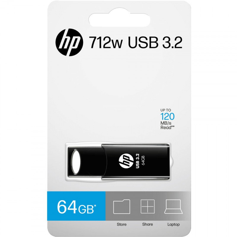"HP 712w. Capacity: 64 GB, Device interface: USB Type-A, USB version: 3.2 Gen 1 (3.1 Gen 1), Read speed: 120 MB/s. Form factor: Slide. Weight: 10.2 g. Product colour: Black"\n"Simplify your mobile lifestyle with the HP 712w USB Flash Drive. The 712w features a sliding capless design, perfect for transporting photos, music and documents. Connect and share your favorite files with the HP 712w USB Flash Drive."