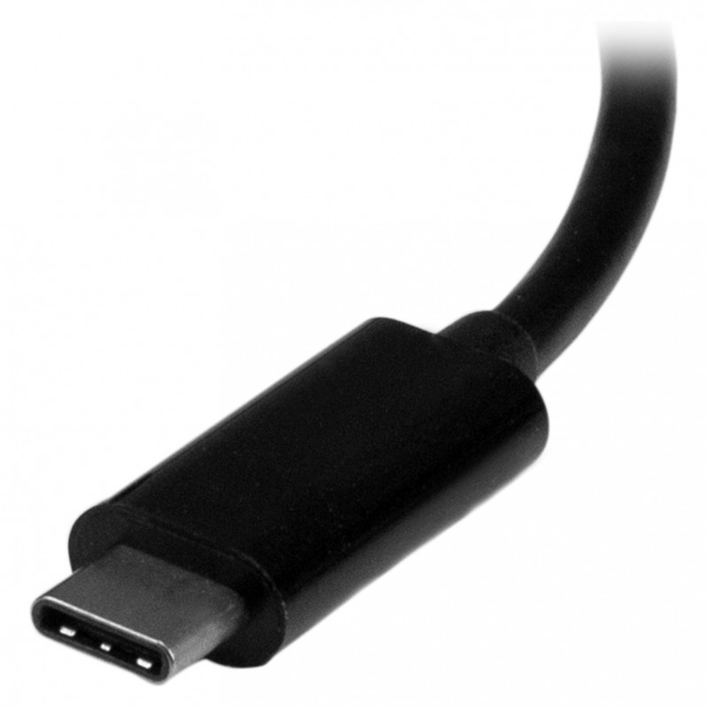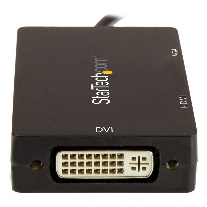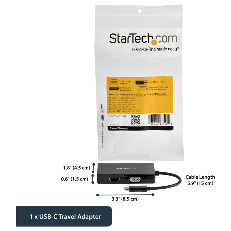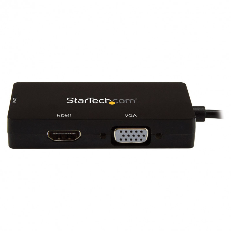 "StarTech.com USB-C Multiport Video Adapter - 3-in-1 - 4K 30Hz - Black. USB connector type: USB Type-C, USB connector gender: Male, Maximum transfer distance: 15.2 m. Product colour: Black. Width: 45 mm, Depth: 85 mm, Height: 15 mm. Package width: 125 mm, Package depth: 225 mm, Package height: 20 mm. Products per master (outer) case: 150 pc(s), Master (outer) case width: 330 mm, Master (outer) case length: 490 mm"\n"USB Type-C™ to VGA DVI or HDMI Travel Adapter | 3-Year Warranty