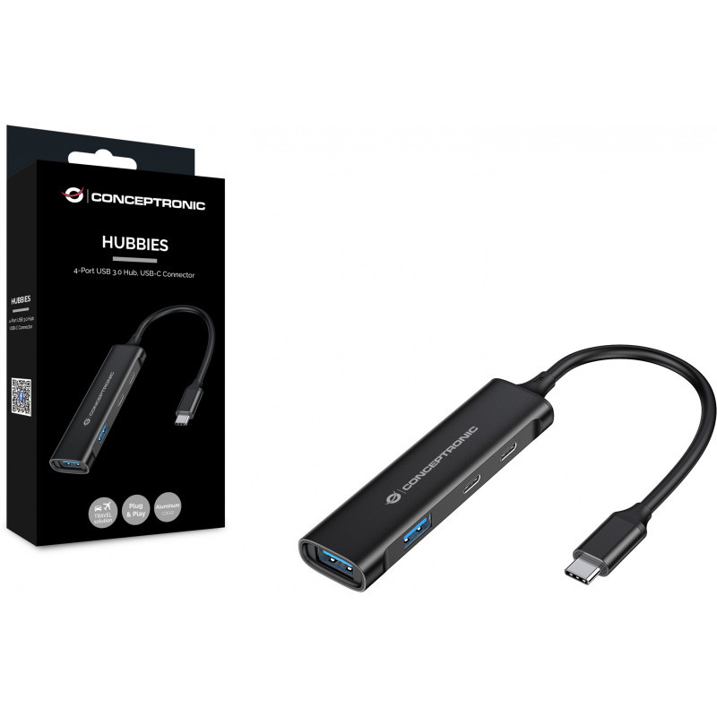 "Conceptronic HUBBIES 4-Port USB 3.0 Hub, 2 USB-C & 2 USB-A ports, aluminum case, USB-C connector. Host interface: USB 3.2 Gen 1 (3.1 Gen 1) Type-C. Data transfer rate: 5000 Mbit/s, Product colour: Black, Housing material: Aluminium. Power supply type: USB. Windows operating systems supported: Windows 10, Windows 10 Education, Windows 10 Education x64, Windows 10 Enterprise, Windows 10..., Mac operating systems supported: Mac OS X 10.10 Yosemite, Mac OS X 10.11 El Capitan, Mac OS X 10.12 Sierra, Mac OS X 10.13 High.... Width: 24 mm, Depth: 92 mm, Height: 12 mm"\n"This 4 ports USB 3.0 hub makes it possible to expand your netbook, notebook or PC with 4 extra USB ports with only using one free USB-C port! You can easily add up to 4 USB devices or gadgets to your netbook, notebook or PC."