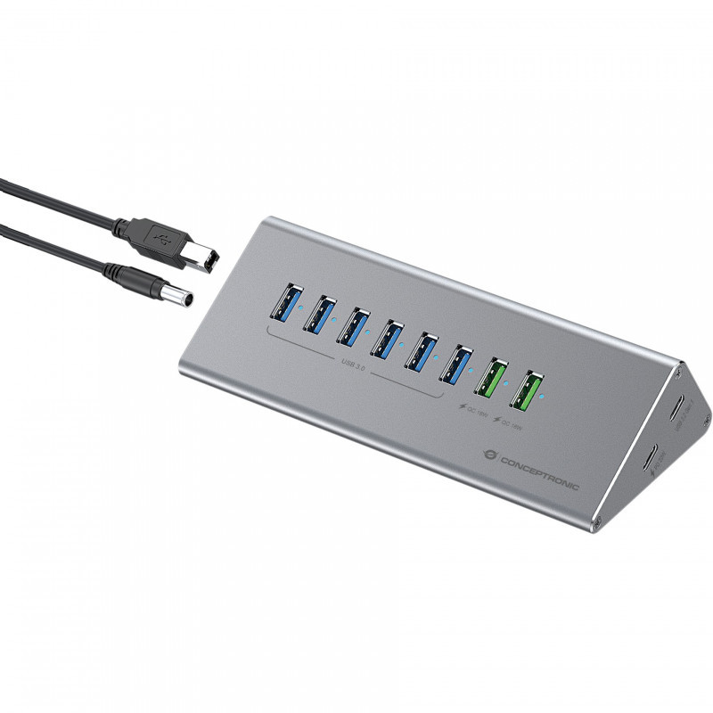 "Conceptronic HUBBIES18G 10-in-1 60W USB 3.0 Hub Charger Combo, 2-in-1 USB-C USB-A Cable, USB 3.2 Gen 1. Host interface: USB 3.2 Gen 1 (3.1 Gen 1) Type-B, Hub interfaces: USB 3.2 Gen 1 (3.1 Gen 1) Type-A, USB 3.2 Gen 1 (3.1 Gen 1) Type-C. Data transfer rate: 5000 Mbit/s, Product colour: Grey, Housing material: Aluminium. Power supply: 60 W, Input voltage: 12 V, Input current: 5 A. Windows operating systems supported: Windows 10, Windows 10 Education, Windows 10 Education x64, Windows 10 Enterprise, Windows 10..., Mac operating systems supported: Mac OS X 10.10 Yosemite, Mac OS X 10.11 El Capitan, Mac OS X 10.12 Sierra, Mac OS X 10.13 High.... Width: 61.7 mm, Depth: 156.3 mm, Height: 37 mm"\n"This 10-in-1 60W USB 3.0 Hub Charger Combo is the ideal desktop solution for your office and home, expanding your device's USB capacity with 10 additional USB ports. It comes with a 2-in-1 USB-A/C hybrid connection cable, making it easy to connect to your laptop or PC's USB-A or USB-C port.