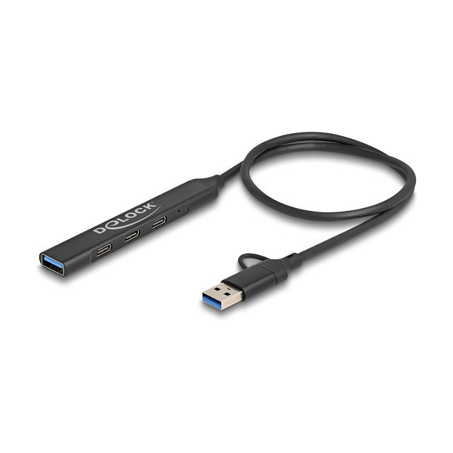 "DeLOCK 4 Port Slim USB Hub with USB Type-C™ or USB Type-A to 3 x USB 5 Gbps USB Type-C™ + 1 x USB 5 Gbps Type-A. Host interface: USB 3.2 Gen 1 (3.1 Gen 1) Type-C, Hub interfaces: USB Type-C. Data transfer rate: 5000 Mbit/s, Product colour: Black, Housing material: Metal. Windows operating systems supported: Windows 10, Windows 10 x64, Windows 11, Mac operating systems supported: Mac OS 13.1, Linux operating systems supported: Linux Kernel 5.15. Width: 17 mm, Depth: 104 mm, Height: 7 mm. Quantity per pack: 1 pc(s), Package type: Hanging box"\n"Description